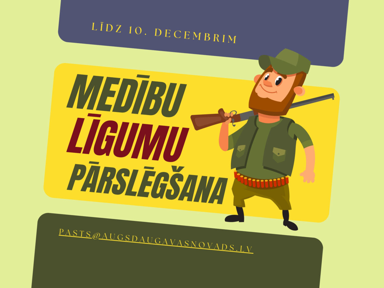 Augšdaugavas novada pašvaldība aicina medību tiesību lietotājus līdz 2025.gada 10.decembrim iesniegt iesniegumus par medību tiesību līgumu pārslēgšanu. Iesniegumus var iesniegt Augšdaugavas novada pašvaldības Centrālajā pārvaldē (Rīgas iela 2, Daugavpils, LV-5401) vai parakstītu ar drošu elektronisko parakstu, nosūtot uz e - pasta adresi: pasts@augsdaugavasnovads.lv. Jautājumu gadījumā aicinām sazināties ar Augšdaugavas novada pašvaldības Centrālās pārvaldes Īpašuma nodaļu, tālr.65476739, 65422232.