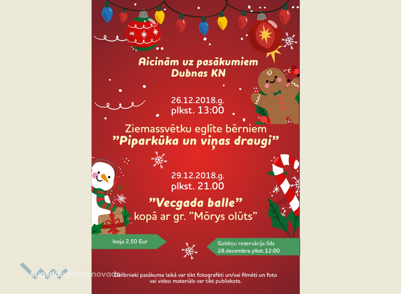 Pasākumi Dubnas kultūras namā21.12.2018AKTUĀLI Priecīgus Ziemassvētkus un Laimīgu Jauno 2019. gadu vēlot, aicinām uz pasākumiem Dubnas kultūras namā. Par dalību "Vecgada ballē" un galdiņu rezervāciju, lūdzam zvanīt pa mob. tālr. 28664534 līdz 28. decembrim plkst. 12.00.