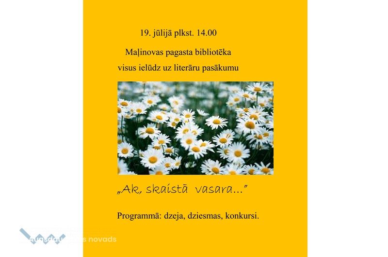 Pasākums „Ak, skaistā vasara…”17.07.2017AKTUĀLI Maļinovas pagasta bibliotēka visus ielūdz uz vasarīgu literāru pasākumu. Izbaudīsim dzejas burvību, muzikālo noskaņu radīs akordeonists Dmitrijs Karpečkovs un Maļinovas interešu kopa „Ivuški”, kā arī vasaras platmaļu konkurss dāmām.Visi laipni lūgti!