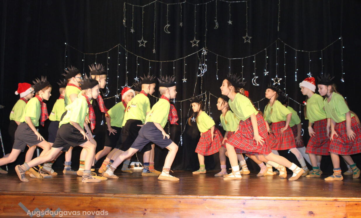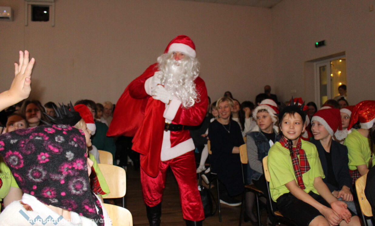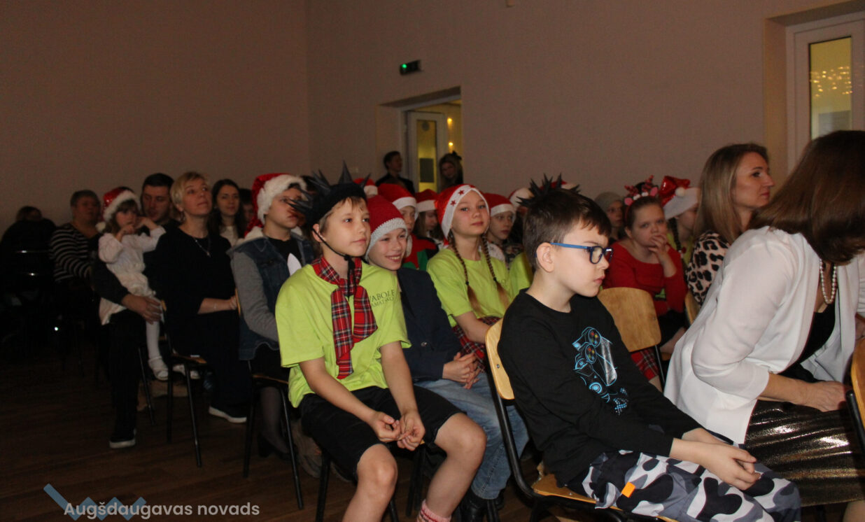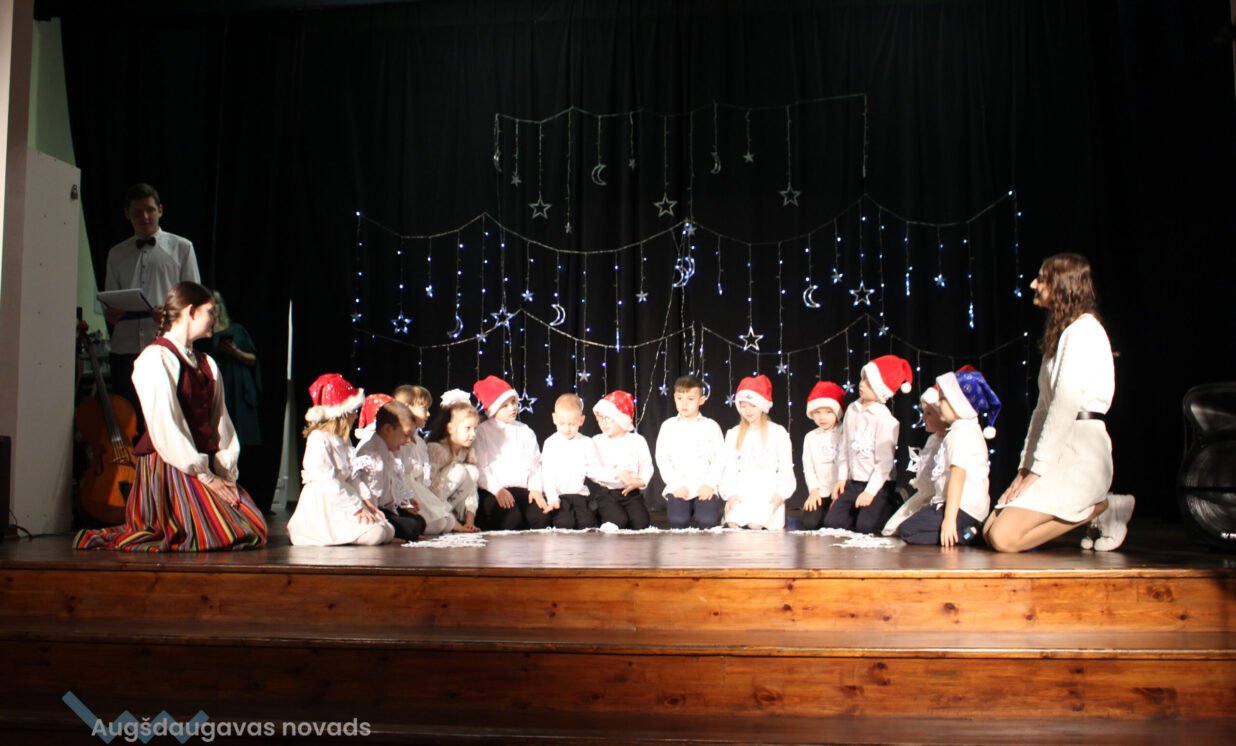 Ar patiesu sirsnību klātesošie sagaidīja mazos pirmskolniekus ar dziesmu “Pirmā sniegpārsliņa”. Drosmīgi visai zālei akordeonu spēlēja 2.klases skolnieks Adriāns un neparasto instrumentu čellu – Megija. Brašie brāļi Jorens un Atvars no kuplās Kārkliņu ģimenes lasīja mammas Dinas pašas sacerēto Ziemassvētku dzejoli. Burvīgas bija mūsu mīļās skolotājas – Linda, Nellija un Ināra Podniece, kas pasākumā ienesa tik dvēselisku noskaņu ar skaistajām laternām un izpildot dziesmu “Veltījums”. Burvīgi bija mazie deju kolektīva eži, kas izpildīja jauku ežu deju. “Sidrabiņa lietiņš lija” skolas folkloras kopas izpildījumā. Burvīgus salto un neizmērījamu lokanību mums rādīja 1.klases skolniece Marija Paukšta. Diemžēl Marijas mamma un mūsu mūzikas skolotāja Katrīna Paukšta, bet visais Latvijai šī gada X-Faktora zvaigzne, bija tā aizsmakusi, ka nevarēja parādīt savu priekšnesumu. Taču klātesošie viņu tāpat sumināja par uzdrīkstēšanos piedalīties televīzijas šovā. Taču vēl vieni televīzijas šova dalībnieki gan kuplināja mūsu pasākumu un bija tā kulminācija – Daugavpils Tumšzilais koris! Tajā piedalījās otra mūsu mūzikas skolotāja Annija.