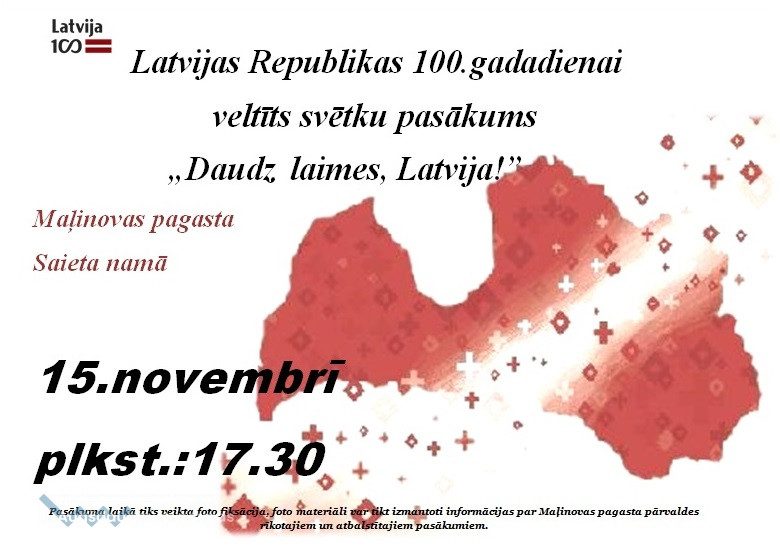 Laipni lūdzam apmeklēt svinīgo pasākumu, veltītu Latvijas Republikas proklamēšanas 100.gadadienai, kas notiks 15.novembrī plkst.:17.30 Maļinovas pagasta saieta namā! Jūs gaidīs svētku koncerts ar pagasta amatiermāksliniekiem un grupu „Dvinskas muzikanti”, kā arī svētku cienasts! Maļinovas pagasta transports kursēs 15 .novembrī pēc sekojoša maršruta: