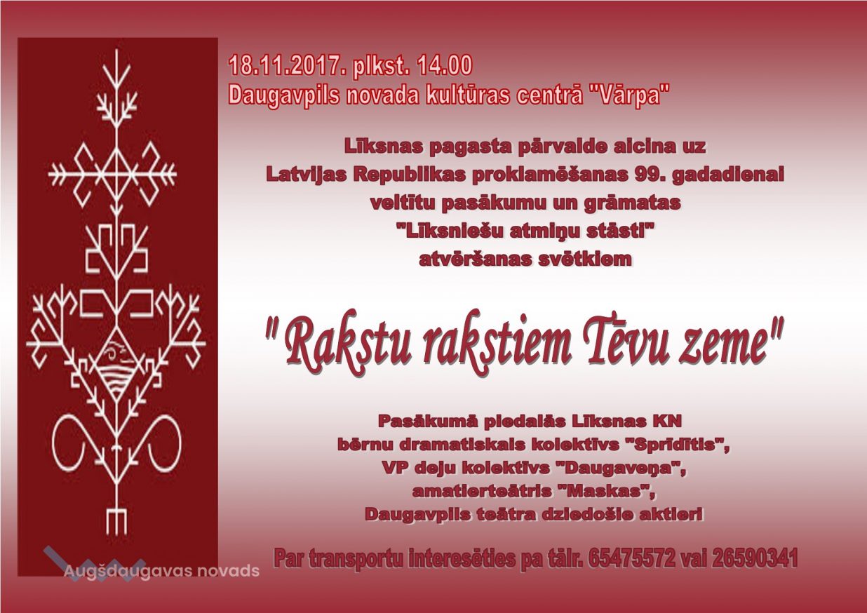 Klāt ir 18. novembris, kad svinēsim Latvijas kā valsts 99. gadadienu. Šo svētku svinības Līksnas pagasta pārvalde rīko saviem pagasta iedzīvotājiem un ciemiņiem. Šoreiz tie būs īpaši, jo pasākuma laikā savus atvēršanas svētkus piedzīvos grāmata "Līksniešu atmiņu stāsti". Tas ir daudzu gadu darba rezultāts, ko paveica līksnieši paši, pieaicinot arī speciālistus no citiem Latvijas novadiem. Lasot šīs atmiņas varam iepazīt Līksnas pagasta vēsturi, izejot cauri gandrīz diviem gadsimtiem.