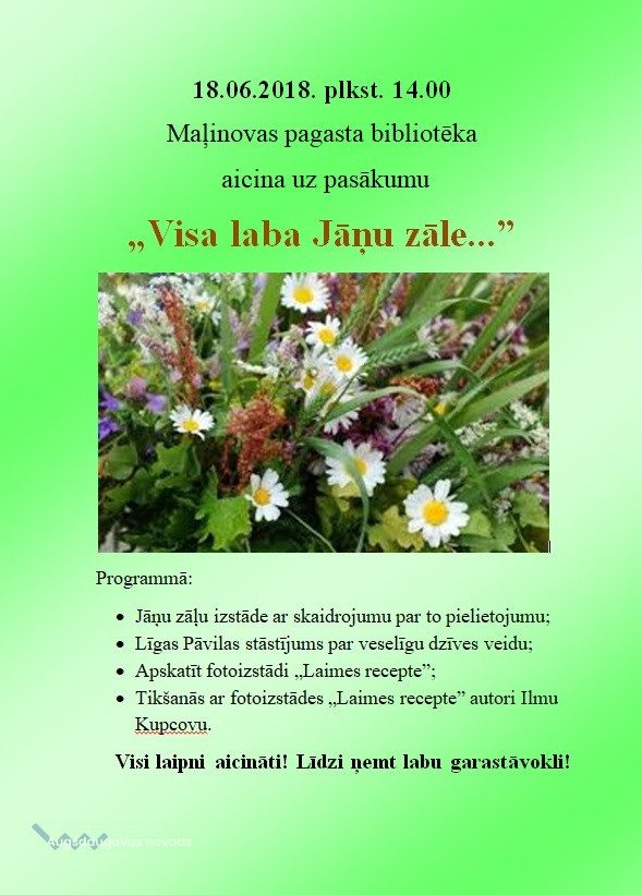 18.06.2018.plkst. 14.00 Maļinovas pagasta bibliotēka aicina uz pasākumu „Visa laba Jāņu zāle...”