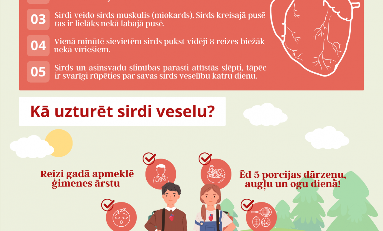 Šogad Pasaules sirds dienā SPKC speciālisti ir izstrādājuši infografiku “7 veidi, kā lutināt sirdi”, apkopojot vienkāršus ieteikumus, kā palīdzēt saglabāt sirds veselību un parūpēties par to ilgtermiņā, un infolapu bērniem un jauniešiem “Pasaules sirds diena”, ietverot aizraujošus faktus par sirdi un svarīgākos ieteikumus sirds veselībai. Pielikumā nosūtām infografiku un infolapu .pdf un .png formātos tematiskās dienas tēmas aktualizēšanai pašvaldībā. Aicinām ievietot sagatavotos materiālus pašvaldības mājaslapā un sociālajos tīklos, kā arī nosūtīt pašvaldībā esošajām izglītības iestādēm, lai veicinātu iedzīvotājos izpratni par sirds veselību.