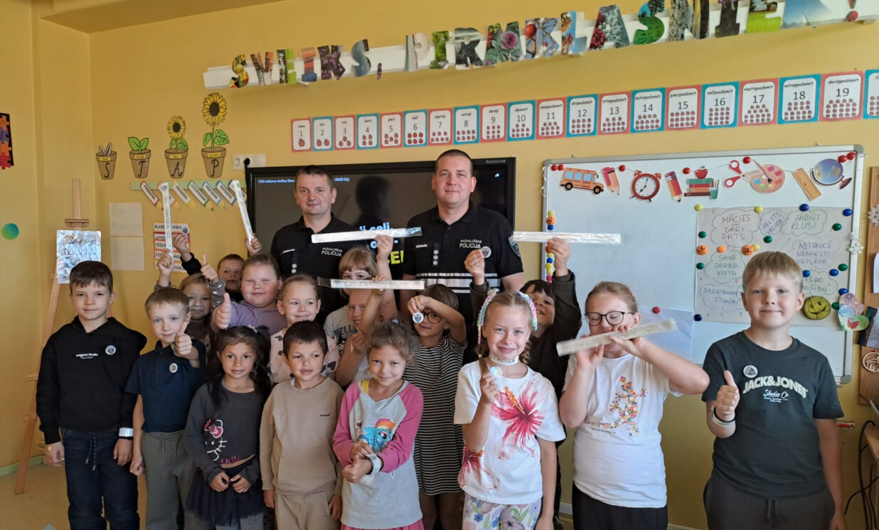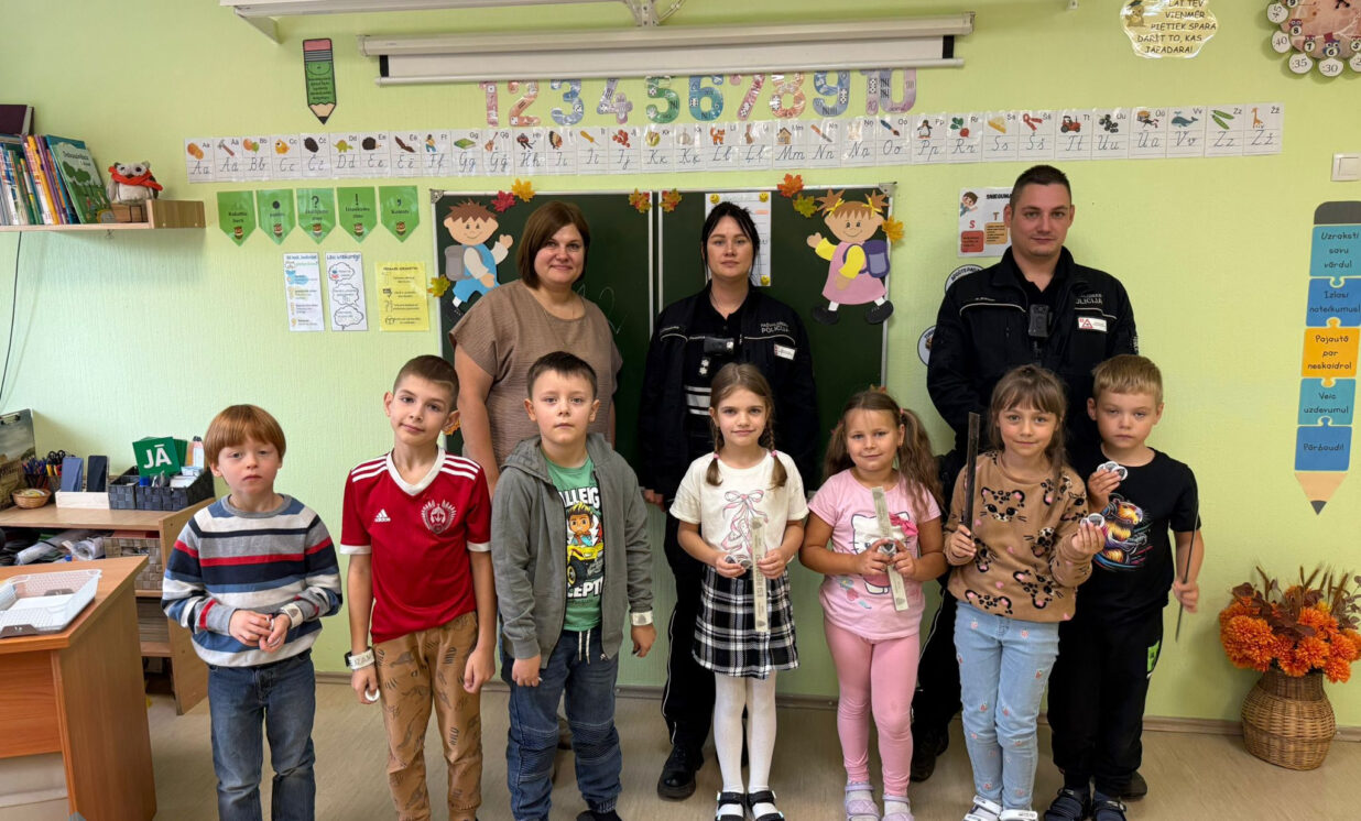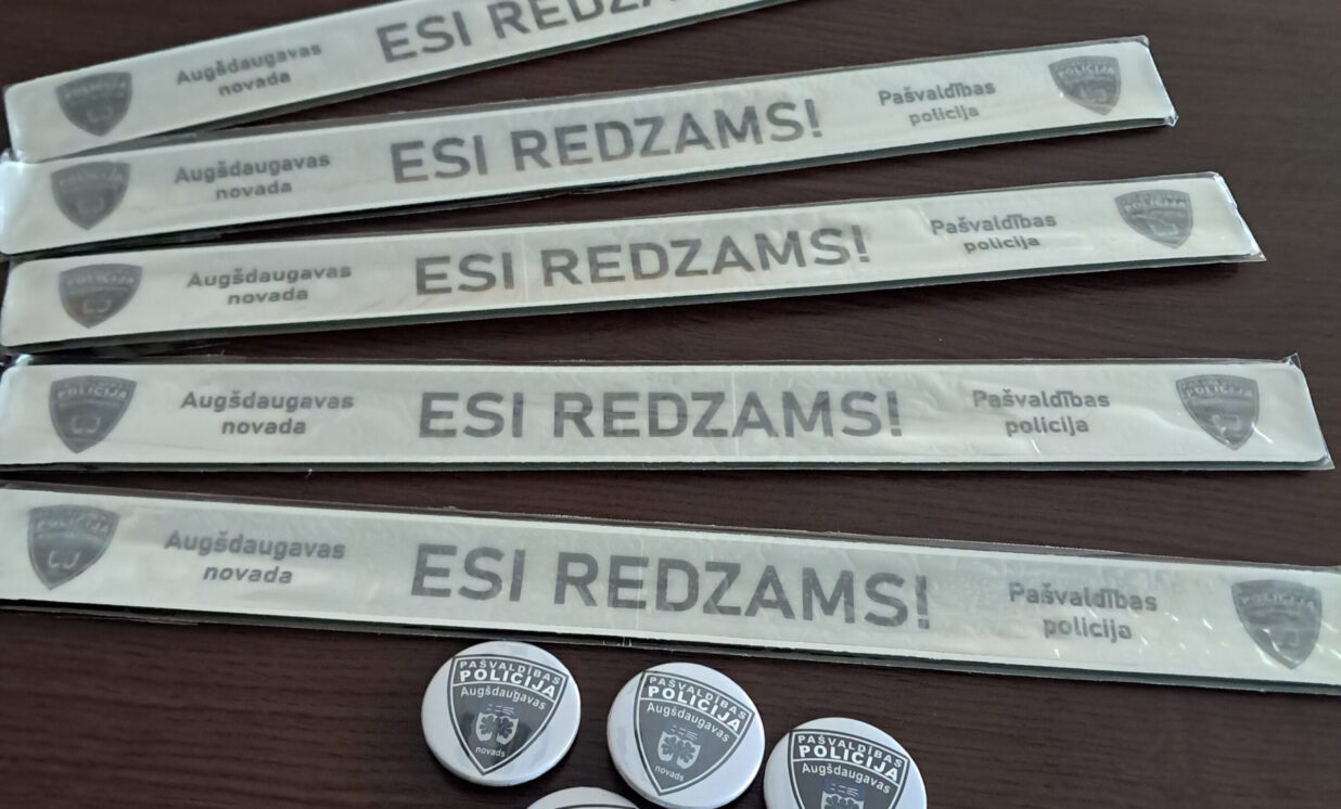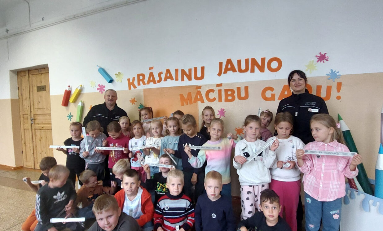 Nobeigumā skolēni saņēma atstarotājus, lai tumšajā diennakts laikā vienmēr būtu pamanāmi uz ceļa, kā arī nozīmītes ar pašvaldības policijas emblēmu.