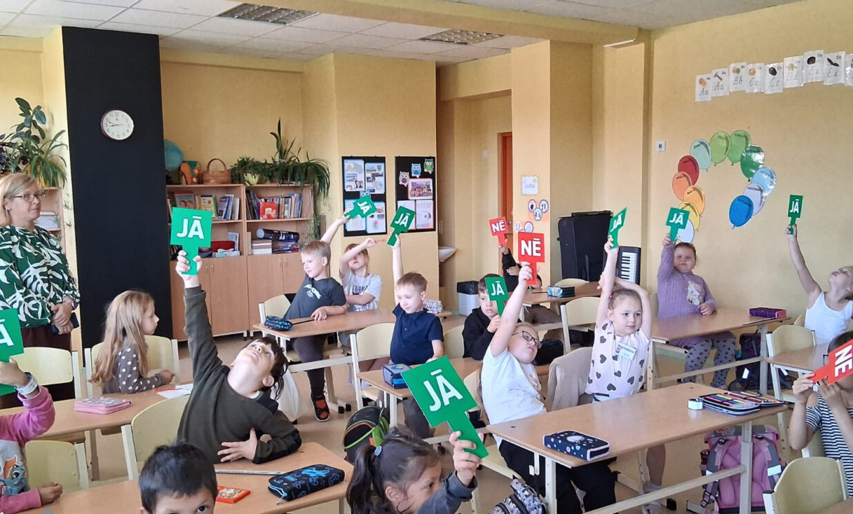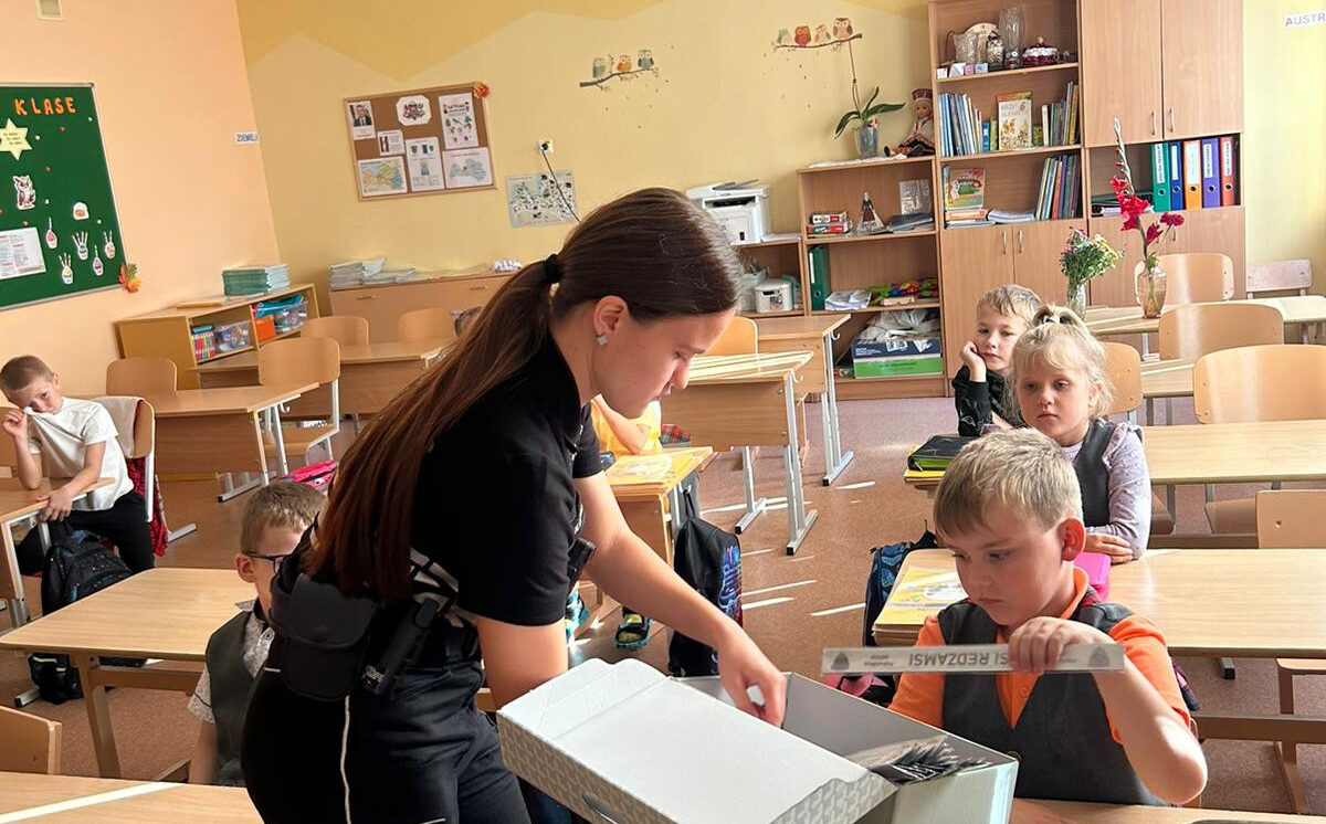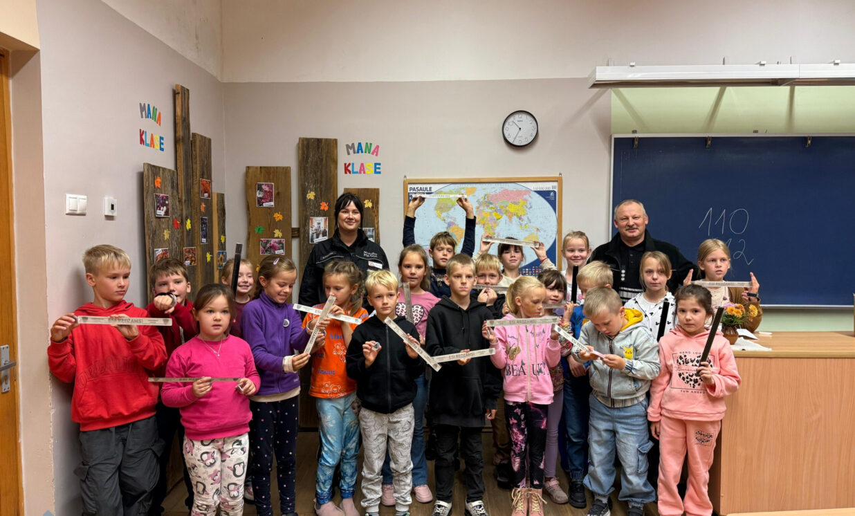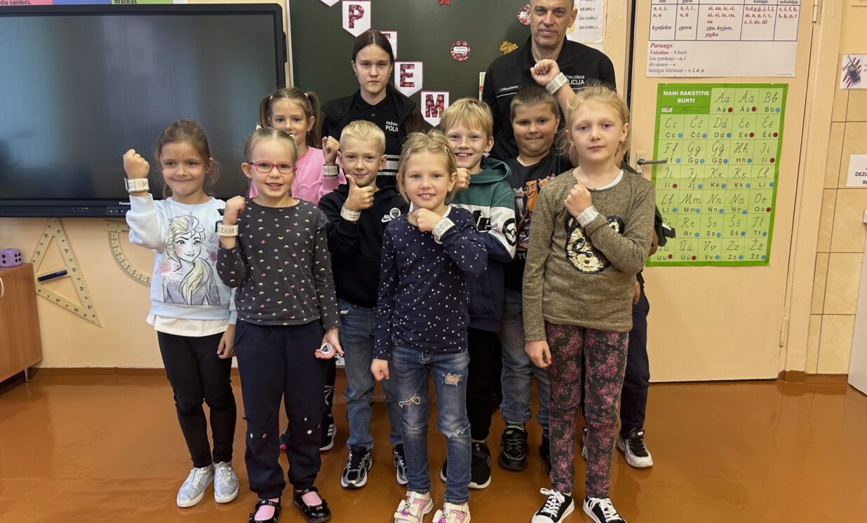 Nobeigumā skolēni saņēma atstarotājus, lai tumšajā diennakts laikā vienmēr būtu pamanāmi uz ceļa, kā arī nozīmītes ar pašvaldības policijas emblēmu.
