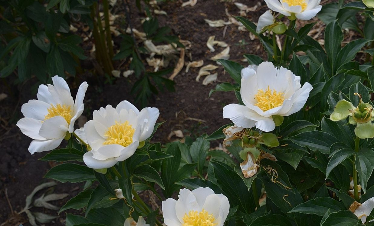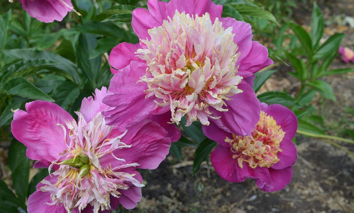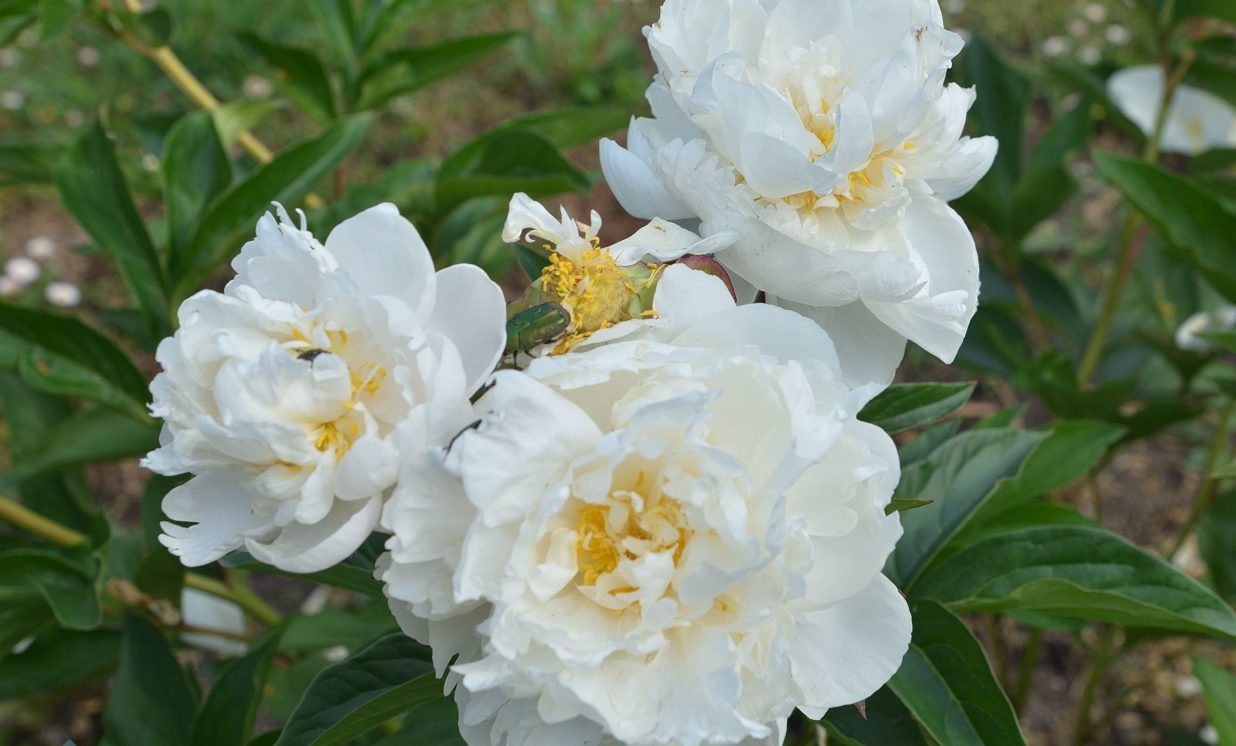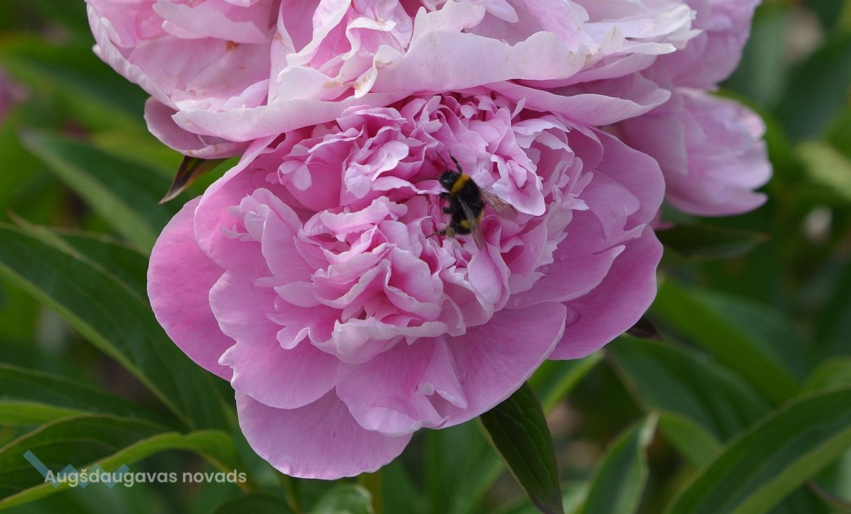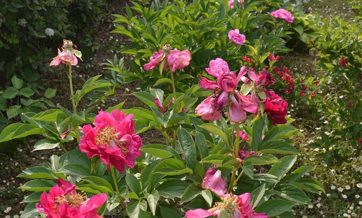 Jūnija vidū daudzas šķirnes jau noziedējušas, bet citas vēl plaukst. Ir peonijas, kam ziedēšanas laiks ilgst divas nedēļas. Visilgāk ar ziediem priecē šķirne ‘Lorelei’. Tā vismaz divas nedēļas plaucē pumpurus, kas sākotnēji līdzinās rozēm. Vismīļākā pašai esot šķirne ‘Mackinac Grand’, kas dāvā spilgti sarkanus, ugunīgus ziedus. Mīļa esot arī ‘Buckeye Belle’, kurai ir tumši ķirškrāsas ziedi. Audzēt peonijas neesot sarežģīti, vienīgi šovasar vairāk jālaista. Ravēšanu un citus dārza darbus Vandas kundze uztver kā dzīves nepieciešamību, jo svarīgi esot būt kustībā, nevarot sēdēt klēpī saliktām rokām.