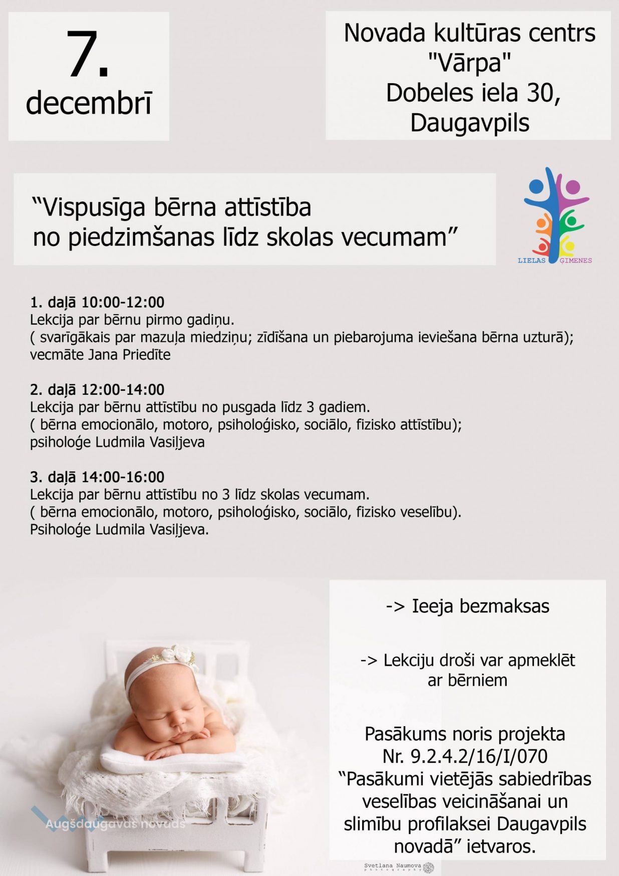 2019. gada 7. decembrī Daugavpils novada Kultūras centrā “Vārpa” notiks perinatālā un neonatālā perioda profilakses pasākums, kura laikā ikvienam interesantam būs iespēja uzzināt par vispusīgu bērna attīstību no piedzimšanas līdz skolas vecumam. Ieeja pasākumā bez maksas. Pasākums tiek īstenots projekta Nr. 9.2.4.2/16/1/070 “Pasākumi vietējās sabiedrības veselības veicināšanai un slimību profilaksei Daugavpils novadā” ietvaros. Vairāk informācijas: Biedrība “Lielas ģimenes” Kontaktpersona: Jana Priedīte, tālr. 28803556