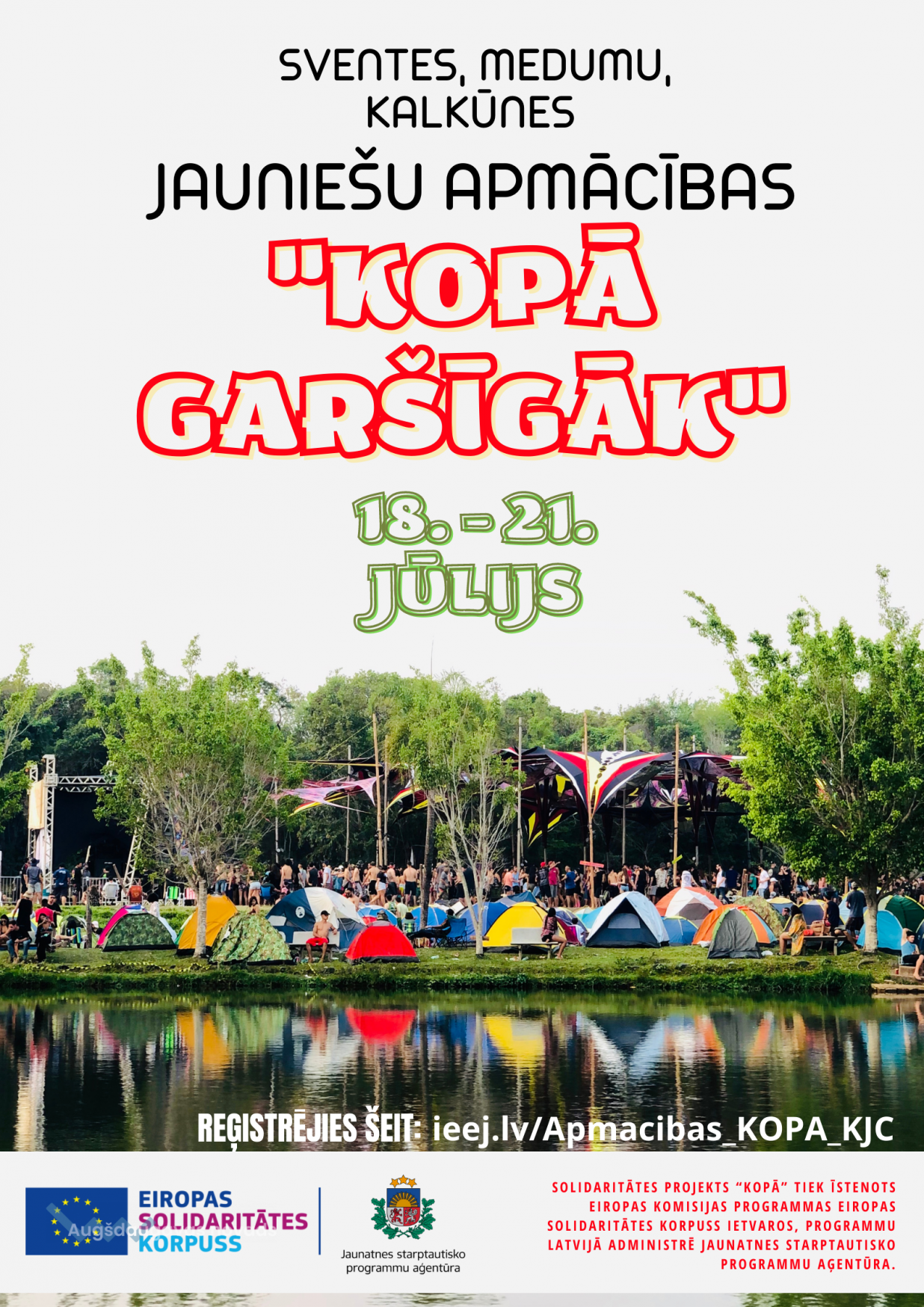 Ja tu esi jaunietis vecumā no 13 līdz 25 gadiem no Kalkūnes, Medumu vai Sventes pagasta, un tu vēlies lietderīgi pavadīt savu brīvo laiku, tad piedalies apmācībās “Kopā Garšīgāk!” Apmācību galvenais mērķis ir izmantojot neformālās izglītības metodes saliedēt Medumu, Sventes un Kalkūnes pagastu jauniešus vienā jauniešu kopienā, sniedzot jauniešiem līdzvērtīgas iespējas attīstīt sevi un pilnveidot savas prasmes.