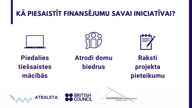 Уже этим летом будет объявлен конкурс проектов, предусматривающий финансовую поддержку для реализации общественных инициатив до 3 тысяч евро на один проект, с целью обеспечения участия различных групп в проекте, развития сотрудничества, снижения стереотипов и укрепления местных сообществ, совместного создания позитивных решений. По словам О. Зугицкого, координатора НКО Dienvidlatgales NVO atbalsta centrs (DNVOAC): «Я рад, что при поддержке British Council (Британского Совета) DNVOAC был создан новый финансовый инструмент для активных жителей Латгалии. Важно, чтобы каждый житель знал о своих возможностях в укреплении гражданского сообщества Латвии, поэтому я призываю жителей региона принять участие в обучении, приобрести новые навыки и способности, а также получить финансирование для укрепления местных общин».