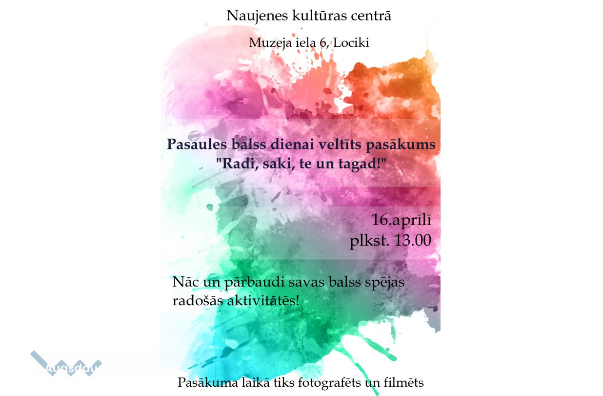 Vai esi kādreiz aizdomājies par to, kāpēc Tava balss skan tā un ne citādāk? Ja tā ir, tad gaidām Tevi Pasaules balss dienai veltītā pasākumā Naujenes kultūras centrā, Muzeja ielā 6, Locikos, 16. aprīlī, plkst. 13.00.
