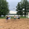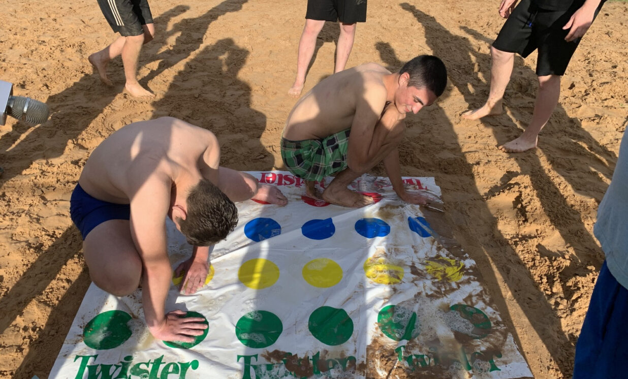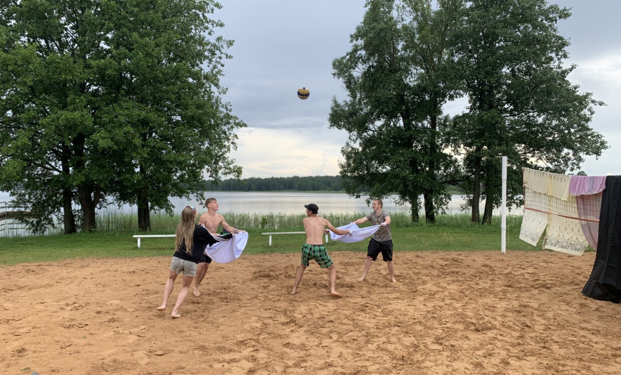 Tālāk sekoja jautras komandu saliedēšanas spēles: dalībniekiem ar aizsietām acīm bija jāizkārtojas pēc auguma, pēc apavu izmēra, alfabētiskā secībā utt. Laika apstākļi uzlabojās, un saulei spīdot, sākās aizraujošs turnīrs “aklais volejbols”, kā arī smieklu pilna Twister spēle uz ziepju slapjas virsmas. Spēlēs vajadzēja arī nest ūdeni no ezera caurās tvertnēs, tāpēc slapjums un smiekli bija garantēti!