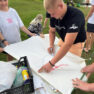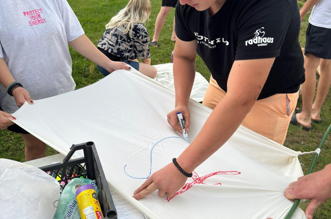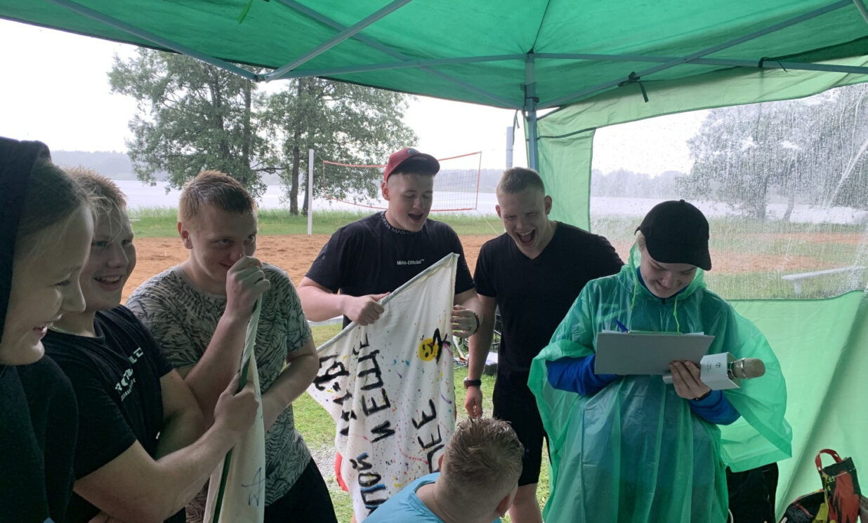 Pirmā aktivitāte – dalībnieku sadale komandās un uzdevums radīt komandas karogu ar nosaukumu un devīzi – tika pārtraukta ar spēcīgu lietu. Taču arī tas neatturēja jauniešus! Visi patvērumu atrada zem nojumēm – citi zīmēja, citi turēja nojumes, lai tās neaizpūš vējš. Otiņas tika padotas no rokas rokā, tās tika mazgātas jau izveidojušās peļķēs, un komandas, neskatoties uz slapjumu, prezentēja savus karogus ar humoru un entuziasmu parādot lielisku saliedētību un pozitīvu garu.