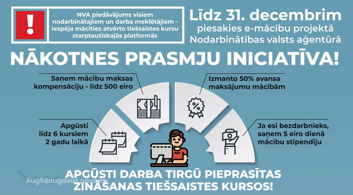 Ekonomikas ministrija (EM) kopā ar Nodarbinātības valsts aģentūru (NVA) aicina līdz šī gada 31. decembrim pieteikties tiešsaistes mācībām, lai iegūtu vai uzlabotu zināšanas un prasmes tādās darba tirgū pieprasītās jomās kā uzņēmējdarbība, datorzinības, datu zinātne, informācijas tehnoloģijas, profesionālās ievirzes svešvalodas, kā arī, lai nostiprinātu, mācīšanās spējas, radošumu, komunikācijas, pašorganizēšanās, pārvaldības un citas prasmes. Mācību kursu dalībniekiem pieejama mācību maksas kompensācija līdz 500 eiro.