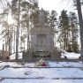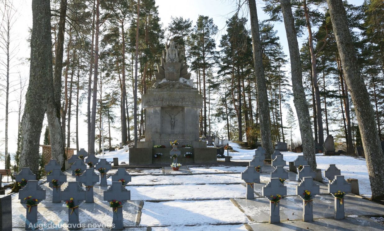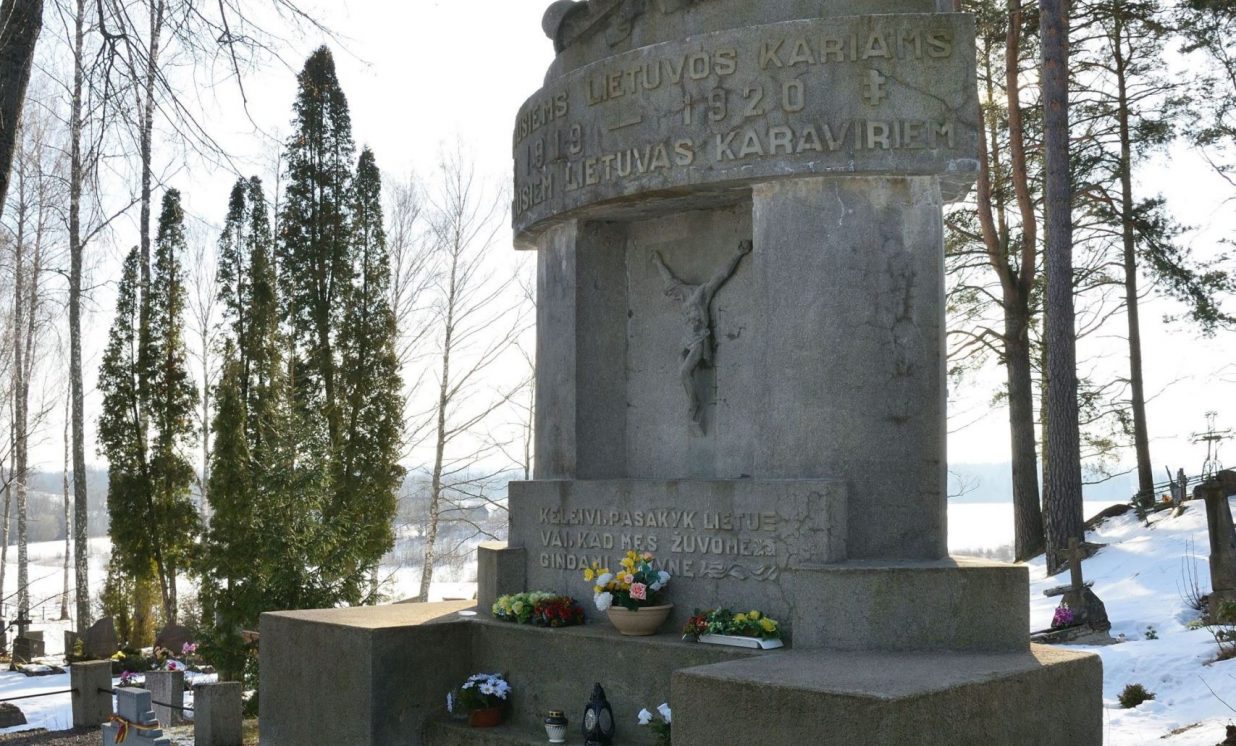 6,5 m augstais piemineklis celts 1932. gadā par Lietuvas valsts līdzekļiem, pieminekli vainago jaunavas figūra — Lietuvas simbols, kas tur rokās plāksni ar Sv. Jura bareljefu, pie tās kājām kritis karavīrs ar šauteni blakus. Apakšā centrā krustā sistā Kristus tēls. Pieminekli veidoja lietuviešu skulptors Stasis Stanišauskas. Uz tā ir redzams uzraksts: “Lietuvas kritušiem karavīriem.” Un tālāk lietuviešu valodā: “Ceļiniek, pasaki Lietuvai, ka mēs kritām, Tēviju aizstāvēdami.”