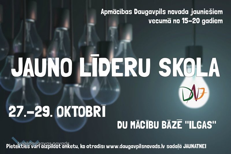 Jaunieši vecumā no 15 līdz 20 gadiem aicināti pieteikties 3 dienu apmācībām “JAUNO LĪDERU SKOLA”, kas norisināsies no 27. Līdz 29.oktobrim Daugavpils Universitātes mācību bāzē “ILGAS”. Programmā izdzīvošanas skola, lekcijas ar dažādu jomu profesionāļiem, organizāciju un projektu līderiem, praktiskās aktivitātes līderības prasmju attīstīšanai un daudz kas cits. Dalībnieku ēdināšana un nokļūšana uz un no apmācību vietu tiks nodrošināta. Vietu skaits ir ierobežots. Visi interesenti tiek aicināti pieteikties aizpildot pieteikuma anketu.