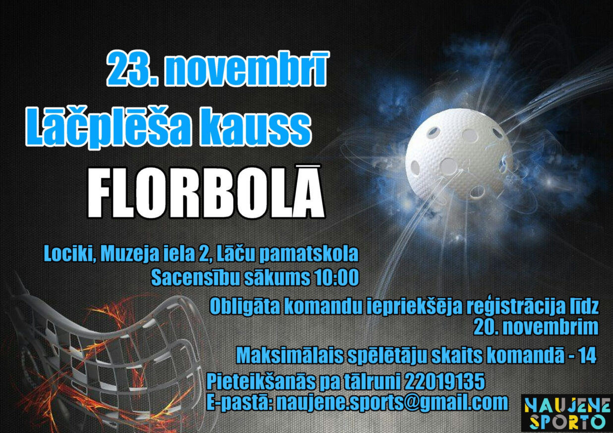 Lāču pamatskolas sporta zālē, Locikos (Muzeja ielā 2) 23. novembrī plkst. 10.00. notiks Lāčplēša kauss florbolā 2024. Komandu reģistrācija sacensību dienā līdz plkst. 9.30.