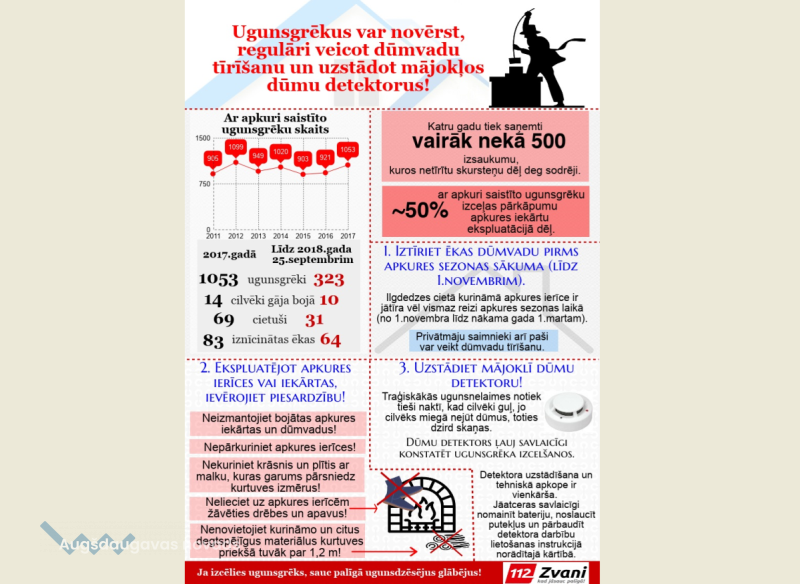 Kā liecina VUGD apkopotā informācija, 2017.gadā tika reģistrēti 1053 ugunsgrēki, bet šogad reģistrēti 323 ugunsgrēki, kuru iespējamais iemesls bija neiztīrīti dūmvadi, nepareizi izbūvētas vai bojātas apkures sistēmas, kā arī to ekspluatācijas noteikumu pārkāpumi. Apmēram puse no šiem ugunsgrēkiem izceļas nepareizas apkures ierīču lietošanas dēļ.