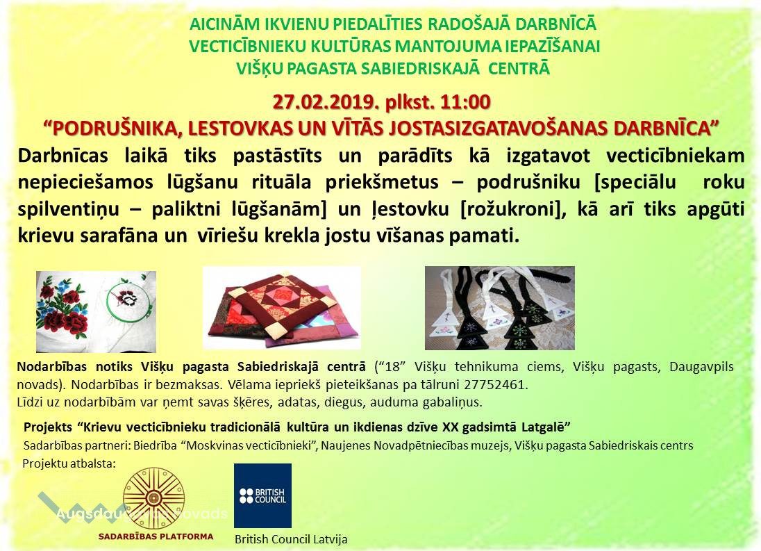 27.februārī plkst. 11:00 Višķu pagasta Sabiedriskajā centrā notiks “PODRUŠNIKA, LESTOVKAS UN VĪTĀS JOSTAS IZGATAVOŠANAS DARBNĪCA” Darbnīcas laikā tiks pastāstīts un parādīts kā izgatavot vecticībniekam nepieciešamos lūgšanu rituāla priekšmetus – podrušniku [speciālu roku spilventiņu – paliktni lūgšanām] un ļestovku [rožukroni], kā arī tiks apgūti krievu sarafāna un vīriešu krekla jostu vīšanas pamati. Nodarbības notiks Višķu pagasta Sabiedriskajā centrā (“18” Višķu tehnikuma ciems, Višķu pagasts, Daugavpils novads). Nodarbības ir bezmaksas. Vēlama iepriekš pieteikšanas pa tālruni 27752461. Līdzi uz nodarbībām var ņemt savas šķēres, adatas, diegus, auduma gabaliņus. Projekta “Krievu vecticībnieku tradicionālā kultūra un ikdienas dzīve XX gadsimtā Latgalē” ietvaros. Sadarbības partneri: Biedrība “Moskvinas vecticībnieki”, Naujenes Novadpētniecības muzejs, Višķu pagasta Sabiedriskais centrs. Projektu atbalsta Britu padome Latvijā un biedrības “Sadarbības platforma”.