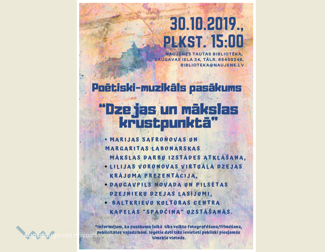 30. oktobrī plkst. 15.00 Naujenes tautas bibliotēka aicina apmeklēt poētiski - muzikālo pasākumu “Dzejas un mākslas krustpunktā”. Pasākuma programmā: Marijas Safronovas un Margaritas Labonarskas mākslas darbu izstādes atklāšana, Lilijas Voronovas virtuālā dzejas krājuma prezentācija, Daugavpils novada un pilsētas dzejnieku dzejas lasījumi, Baltkrievu kultūras centra kapelas “Spadčina” uzstāšanās. Pasākums notiks pēc adreses: Daugavas iela 34, Krauja, Naujenes pagasts, Daugavpils novads, Uzziņas pa tālr. 65450246, biblioteka@naujene.lv.