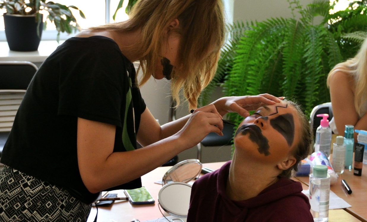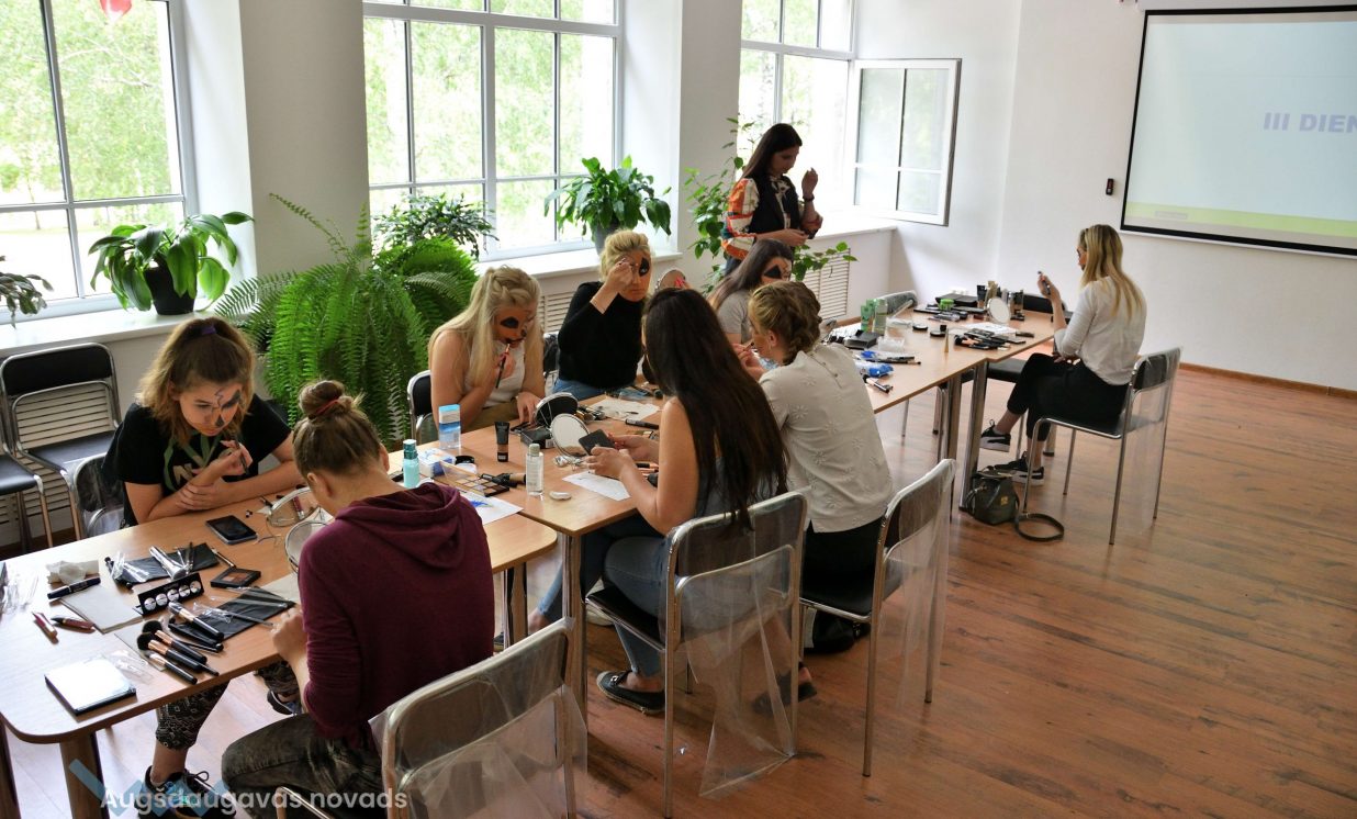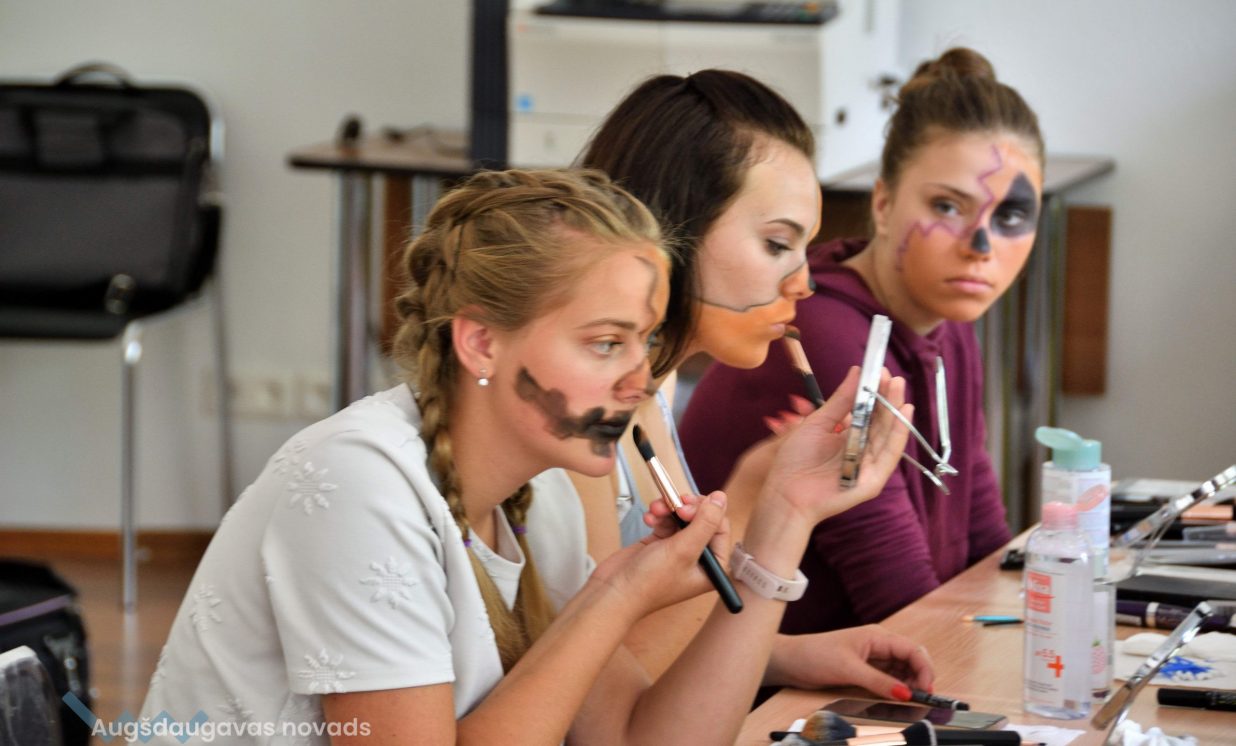 ”Katra diena mums ir sadalīta vairākās niansēs. Ir teorētiskā daļa un ir praktiskā daļa. Pirmajā dienā mēs iepazināmies, kas ir sejas kopšana, otrajā dienā mēs mēģinājām uzlikt dienas grimu. Trešajā dienā kā redzams mēs mēģinām, trenējamies, mācamies uzklāt tēla grimu jeb helovīna grimu,” skaidro Jaunatnes lietu speciāliste Linda Laizāne.