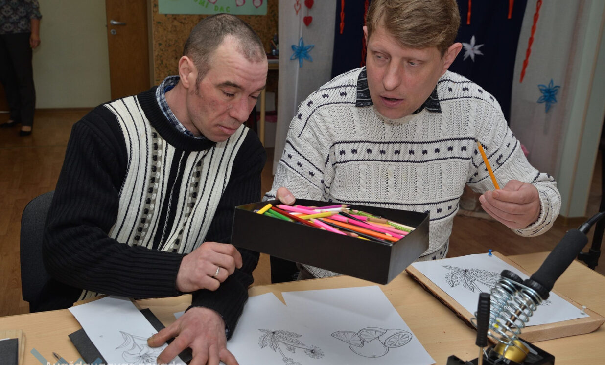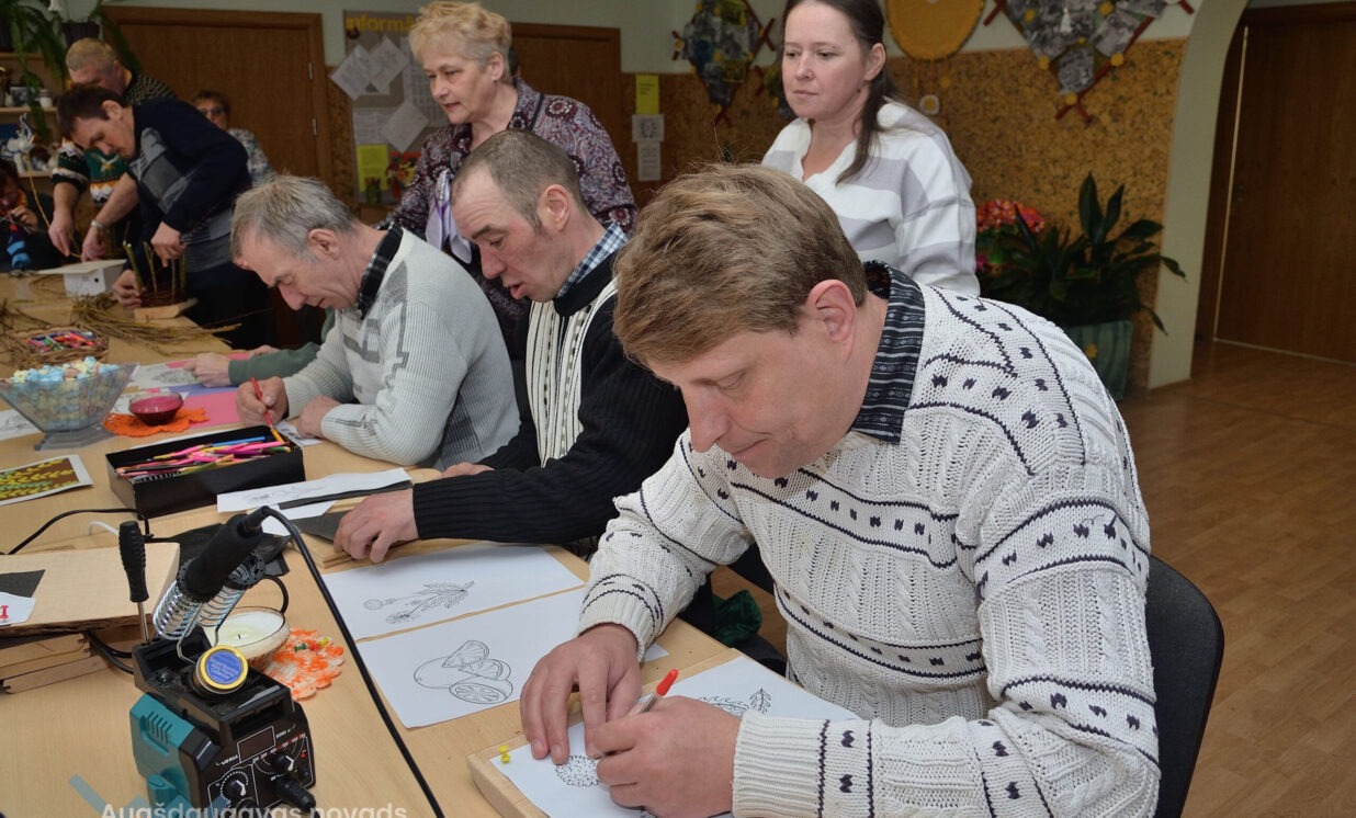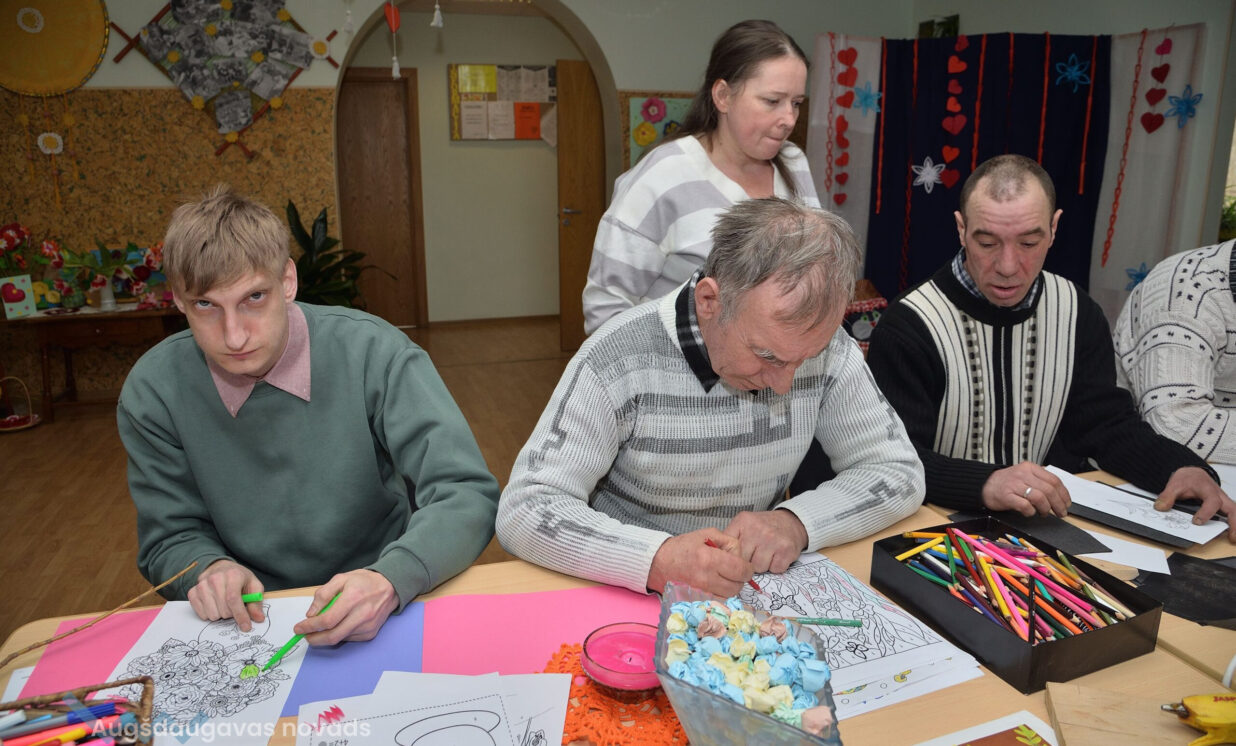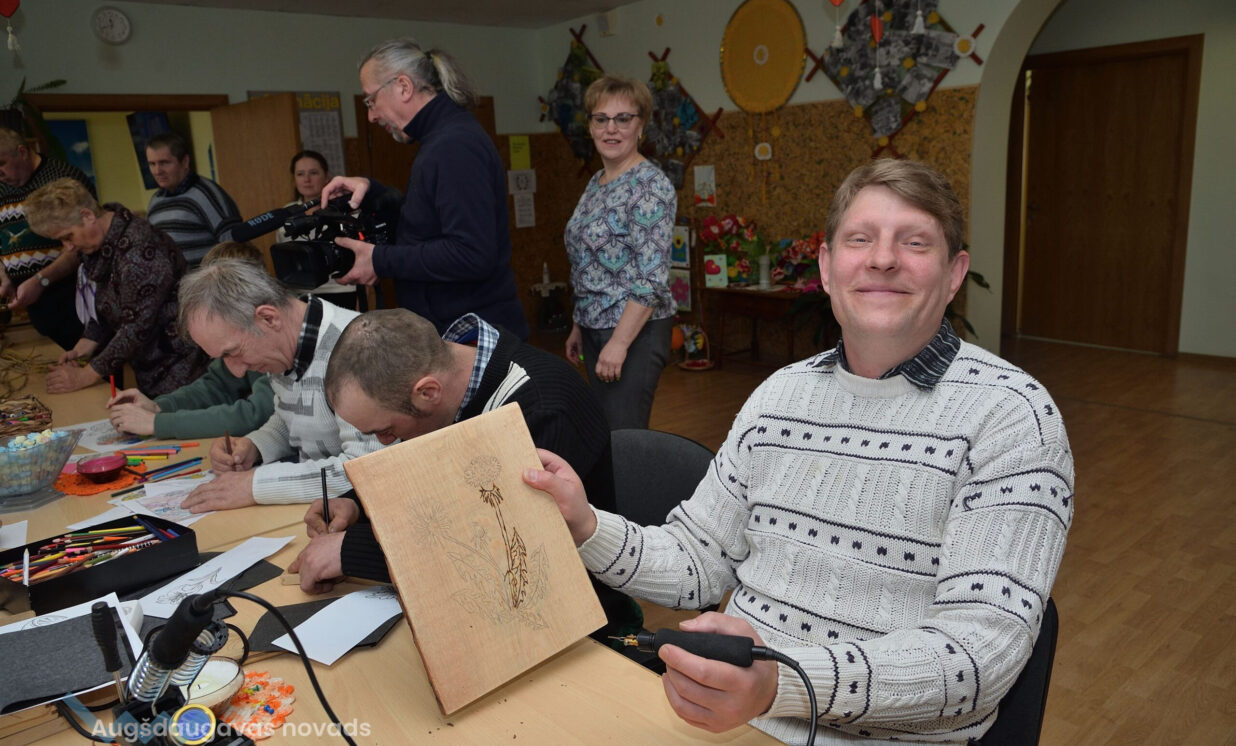 Centra kliente Larisa Iznova 24 gadus nodzīvoja Kalupes pansionātā, bet nu par viņas mājām kļuvuši grupu dzīvokļi Nīcgalē, kur viņa jūtas ļoti labi. Uz dienas centru Larisai patīk braukt, lai lietderīgi pavadītu laiku nodarbībās, satiktu draugus, iemācītos ko jaunu. Sieviete ļoti rūpīgi pārzīmē uz dēlīša rudzupuķi, ko pēc brīža jau skaisti iededzina kokā.