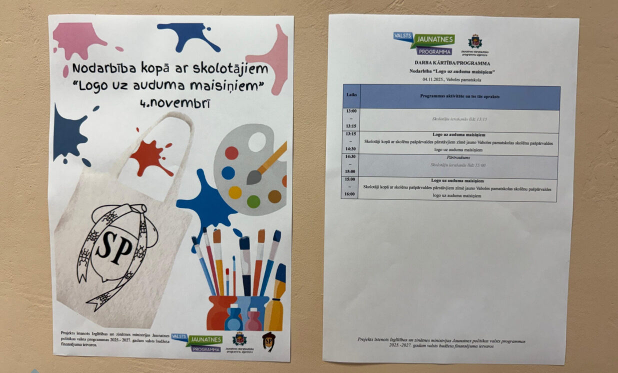 Sākot ar 4. novembri un turpinoties nedēļas garumā, laikā, kad skolotājiem bija iespēja veltīt laiku radošām aktivitātēm, Vaboles pamatskolā norisinājās radoša un neformāla nodarbība “Logo uz auduma maisiņiem”, ko organizēja skolēnu pašpārvalde sadarbībā ar skolas pedagogiem.