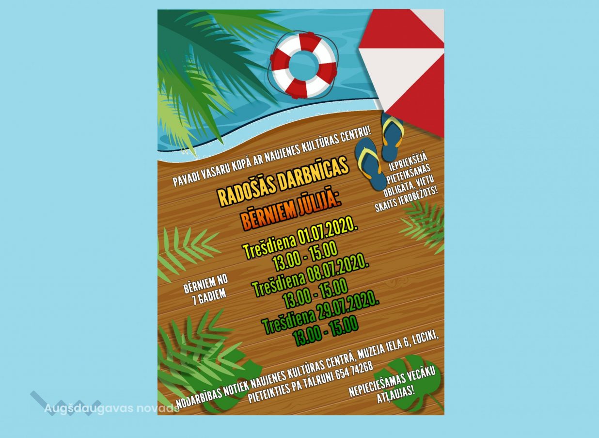 Lai pieteiktos, gaidīsim Jūsu zvanu uz 65474268 vai rakstiet savu pieteikumu uz e-pastu: naujene_kc@inbox.lv – bērna vārds, uzvārds, vecums. Lai piedalītos radošajā darbnīcā, vecākiem būs jāparaksta vecāku atļauja. Vecāku atļauju var saņemt klātienē, ierodoties Naujenes kultūras centrā, Muzeja iela 6, Lociki, jebkurā darba dienā no plkst. 09.00 līdz 17.00. Tiem bērniem, kas ir apmeklējuši darbnīcas jūnijā, pieteikties nav nepieciešams.