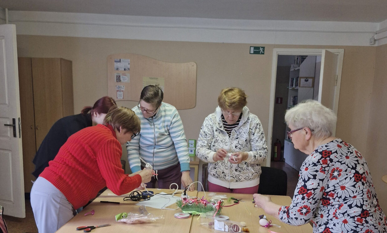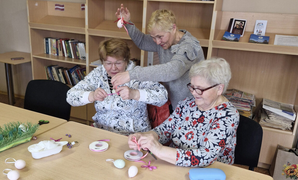 Gaišo Lieldienu svētku priekšvakarā 16. aprīlī Naujenes sociālo pakalpojumu un sociālās palīdzības centra aktīvie seniori piedalījās radošās darbnīcas meistarklasē “Lieldienas krāsu virpulis”, kas noritēja Naujenes Bibliotēkas pakalpojumu sniegšanas vietā Vecstropos. Nodarbību vadīja bibliotekāre Santa Grimailova, kura demonstrēja interesantākās dažādas Lieldienu olu dekora izpildījuma tehnikas. Dalībnieki ar interesi izmēģināja dažādas olu dekora izpildes tehnikas izmantojot sagatavotus daudzveidīgus materiālus. Darbošanās laikā valdīja rosīga sarunu atmosfēra. Šī kopīgā darbošanās ne tikai ļāva radīt skaistus Lieldienu olu rotājumus, bet arī stiprināja savstarpējo sadarbības saikni , kā arī radīja patīkamu svētku noskaņu. Atmosfēra bija patiesi jauka- skanēja joki, smiekli, kur dalībnieki un meistarklases vadītāja apmainījās ar radošām idejām un labu noskaņojumu. Pasākums senioriem patika, garastāvoklis pacilāts, visiem lies prieks par pašu rokām izrotātām Lieldienu olām. Pateicība radošās darbnīcas meistarklases vadītājai bibliotekārei Santai Grimailovai par sadarbību.