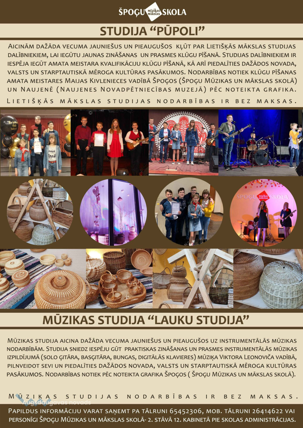 Aicinām visus interesentus kļūt par Lietišķās mākslas studijas dalībniekiem, lai iegūtu jaunas zināšanas un prasmes klūgu pīšanā. Studijas dalībniekiem ir iespēja iegūt meistara amata kvalifikāciju klūgu pīšanā, kā arī piedalīties dažādos novada, valsts un starptautiskā mēroga kultūras pasākumos. Nodarbības notiek klūgu pīšanas amata meistares Maijas Kivlenieces vadībā Špoģos (Špoģu Mūzikas un mākslas skolā) pēc noteikta grafika.