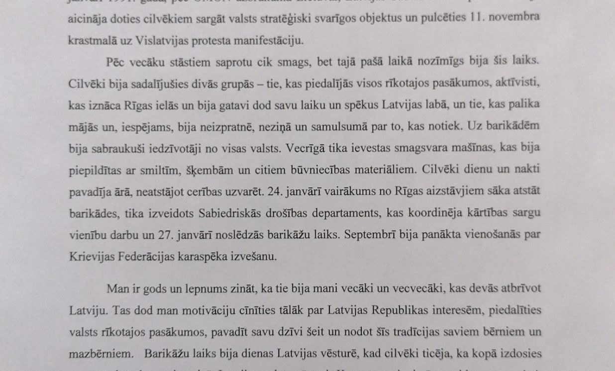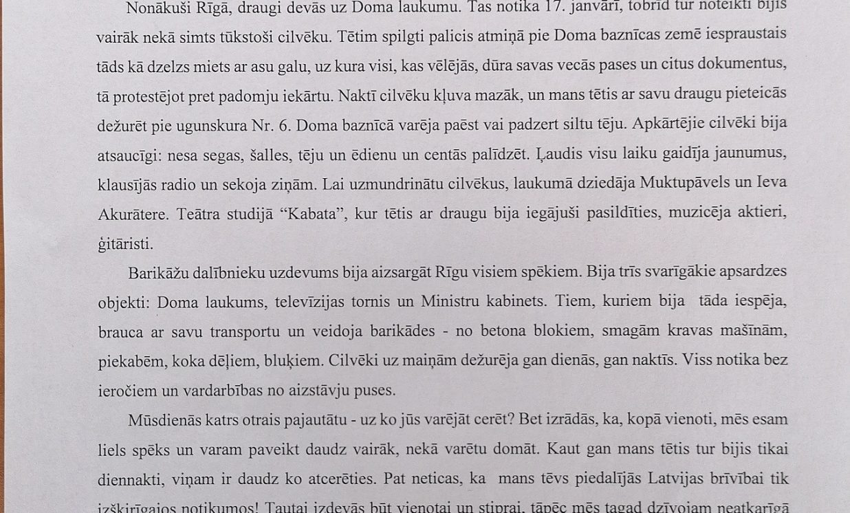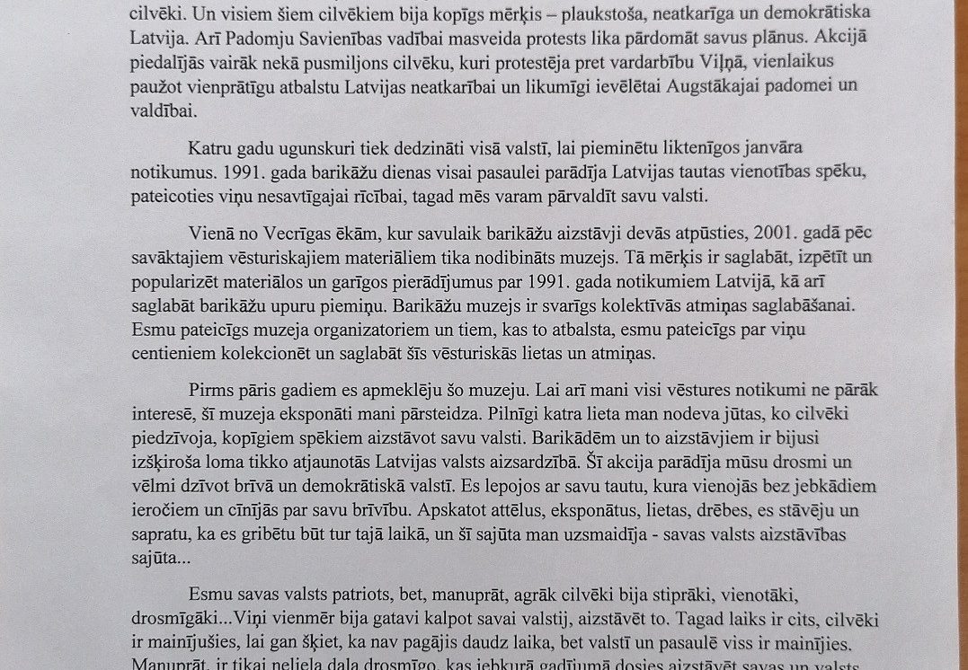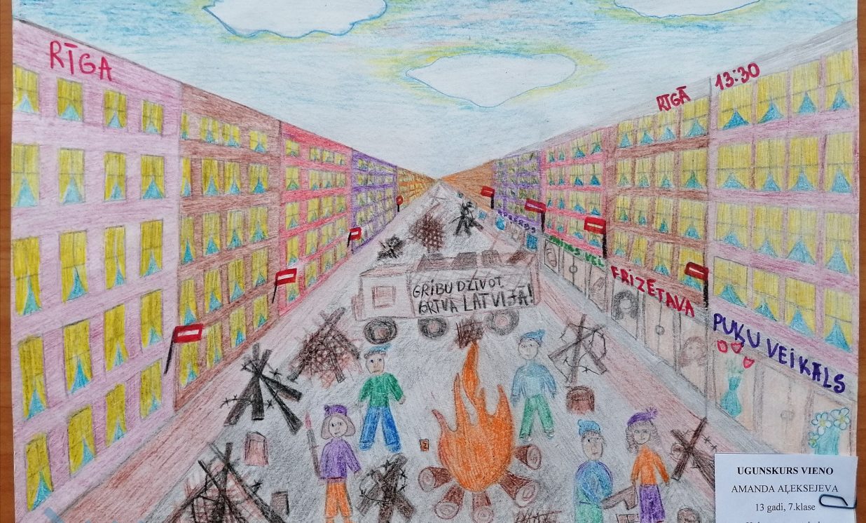 Šogad janvārī aprit 30 gadi kopš 1991. gada janvāra barikādēm. Atceroties šos notikumus, Daugavpils novada domes Izglītības pārvalde skolēniem rīkoja radošo darbu konkursu “Barikādēm-30” ar mērķi audzināt bērnos un jauniešos patriotisma jūtas, veicināt pilsonisko līdzdalību un stiprināt vēsturisko atmiņu 1991. gada Barikāžu notikumu izzināšanā un piemiņas saglabāšanā. Konkursam četrās vecuma grupās tika iesniegti 25 darbi: 19 zīmējumi, 2 fotokolāžas, 2 pārdomas, 1 atmiņu stāsts un 1 intervija. Katrā darbā var just bērna, jaunieša personīgo skatījumu uz mūsu valstij svarīgiem notikumiem, kas risinājās pirms 30 gadiem. Ar konkursa rezultātiem var iepazīties šeit: https://www.daugavpilsnovads.lv/berni-un-jauniesi-savos-darbos-atspoguloja-barikazu-temu/ Paldies visiem dalībniekiem par ieguldīto darbu un skolotājiem par atbalstu un padomu došanu! Ņemot vērā epidemioloģisko situāciju valstī, izstāde klātienē nebūs pieejama. Piedāvājam iepazīt radošo darbu stāstus un aizceļot laikā virtuāli. Konkursa darbi