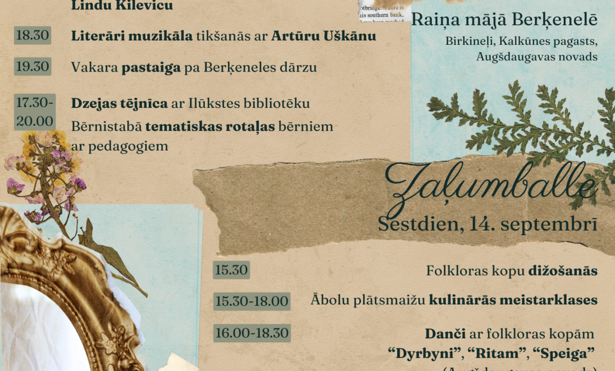 Sestdienas, 14.septembra, pēcpusdienā Raiņa mājā Berķenelē notiks Zaļumballe. Sarīkojums sāksies plkst. 15.30 ar folkloras kopu dižošanos, bet no plkst. 16.00 līdz 18.30 ikvienam būs iespēja izdejoties dančos, ko spēlēs un vadīs Augšdaugavas novada folkloras kopas “Dyrbyni”, “Ritam”, “Speiga” un etnokompānija “Zeidi” no Rīgas. Paralēli dančiem notiks arī ābolu plātsmaižu kulinārās meistarklases. Dalība ir bezmaksas. Dreskods – tautastērps, 19.gs. svētku tērps vai tā elementi.