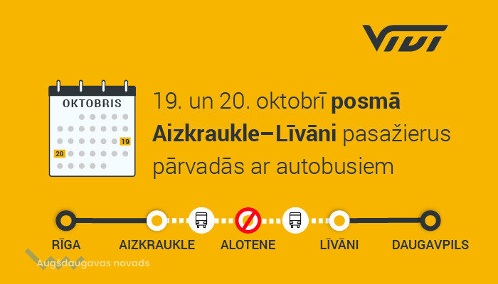 Šī gada 19. un 20. oktobrī Daugavpils līnijā pēdējos vakara reisos posmā Aizkraukle–Līvāni abos virzienos vilcienu pasažierus Vivi pārvadās ar autobusiem, jo VAS “Latvijas dzelzceļš” veiks pārbrauktuves remontdarbus. Autobuss nepiestās pieturā Alotene.