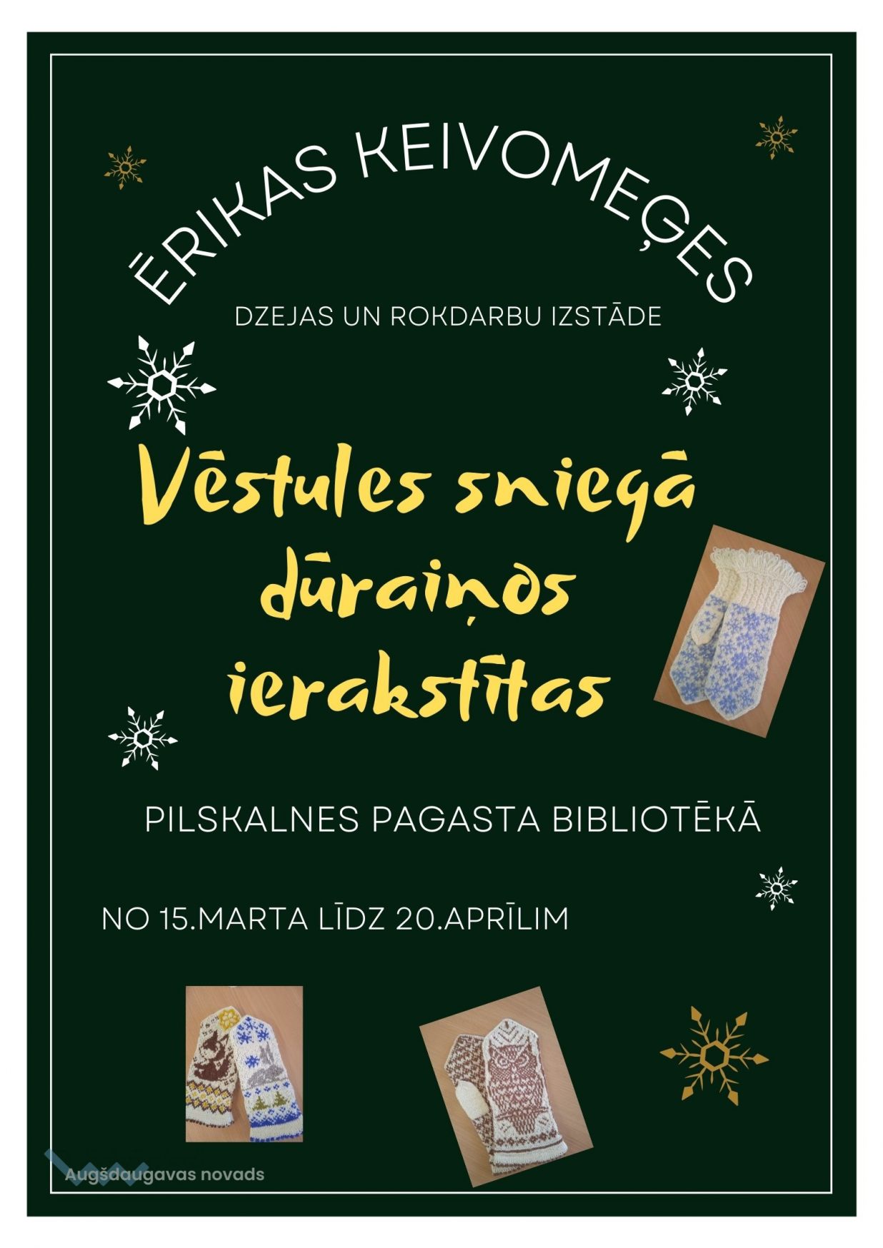 Pilskalnes pagasta bibliotēka aicina no 15. marta līdz 20. aprīlim apmeklēt Ērikas Keivomeģes dzejas un rokdarbu izstādi "Vēstules sniegā dūraiņos ierakstītas".
