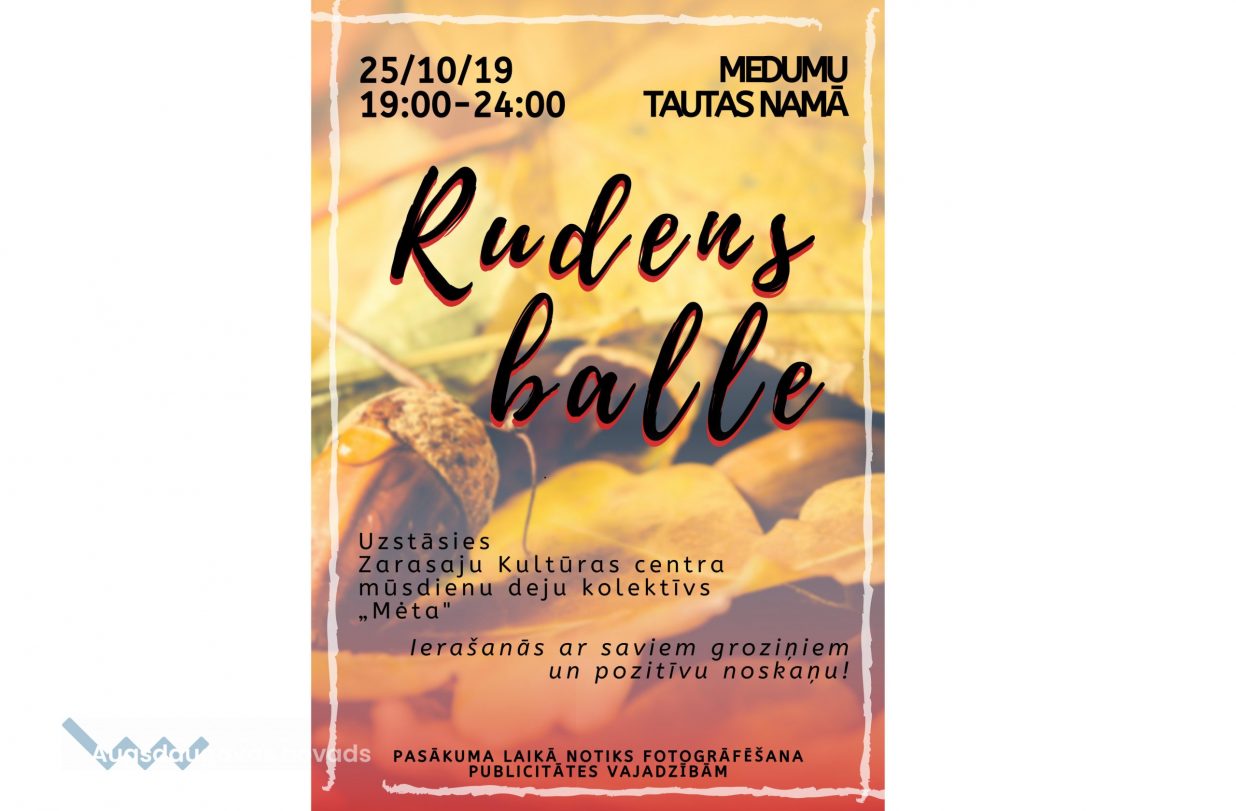 Kad raža jau novākta, visi labumi iesālīti, iemarinēti un novārīti, un mājas dzīves ritms mazpamazām kļūst mierīgāks, pienāk laiks, kad var pelnīti atpūsties no visiem pavasara un vasaras darbiem. Aicinām kopā pavadīt laiku un atpūsties rudens ballē Medumu Tautas namā šī gada 25. oktobrī sākot no plkst. 19:00. Pasākumu atklās Zarasu pilsētas Kultūras centra mūsdienu deju kolektīvs “Meta”, kas iepriecinās mūs ar dažādiem oriģināliem deju priekšnesumiem. Pēcāk mēs paši nodosimies dejām ne maz ne sliktāk kā virpuļojošās koku lapas, kas dod mums saprast, ka drīz vien pienāks brangās ziemas laiks. Tāpēc nezaudējam laiku pirms lielais aukstums nāks un izbaudām dančus un sarunas, kuras sildīs vēl visu ziemas laiku.