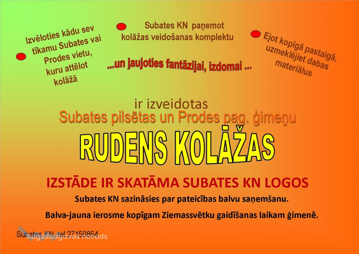 Subates un Prodes ģimenes atsaucās Subates KN aicinājumam izveidot Rudens kolāžu. Uzdevumā tika saņemti dažādi piederumi šādam darbiņam, kā arī tika lūgts izmantot dabas materiālus. izgatavotie darbi pārsteidza ar savu rūpību, izdomu. Īsti mākslas darbi! Līdz 1.decembrim kolāzu izstāde ir skatāma Subates KN logos un arī FB lapā Atputa Subate.Pateicība ģimenēm par radošo darbu. BAlvās gimenes saņems vēl kādu ierosmi Ziemassvētku gaidīšanas laikā.