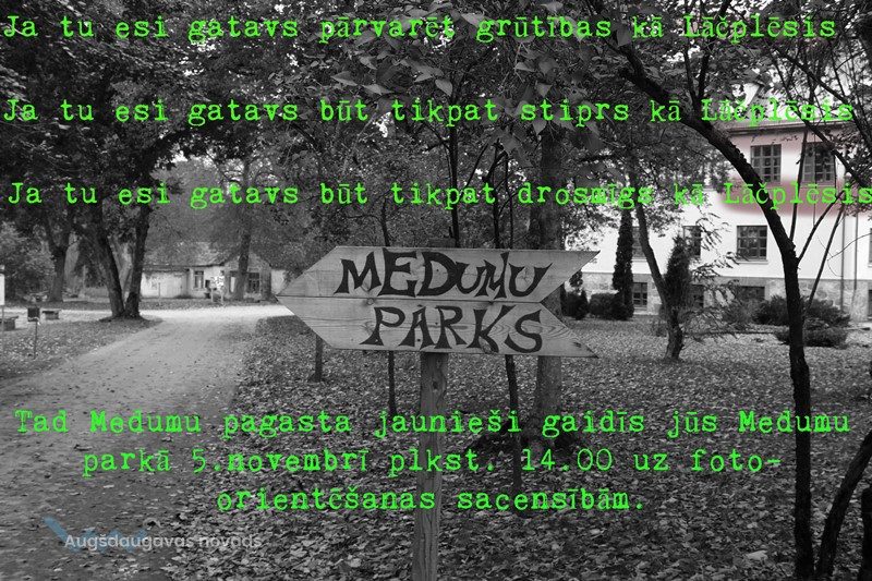 Medumu pagasta jaunieši aicina Daugavpils novada drosmīgus, stiprus un veiklus jauniešus piedalīties orientēšanās sacensībās "Foto-orientēšanās Medumu parkā". Lūdzam obligāti apstiprināt dalību pasākumā līdz 1.novembrim, zvanot pa tālruni Diānai Mikulānei - 27029325 vai sūtot vēstuli uz e-pastu diana.mikulane@inbox.lv