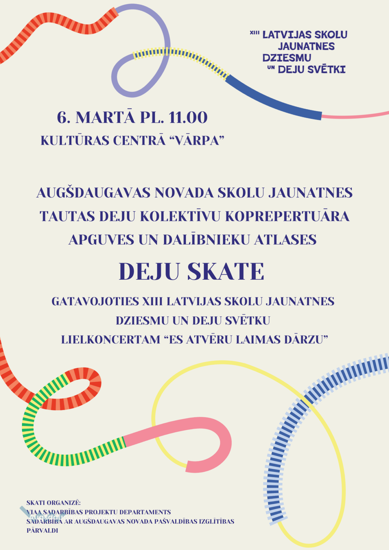 5. martā sākas tautas deju kolektīvu koprepertuāra pārbaudes skates, gatavojoties XIII Latvijas Skolu jaunatnes dziesmu un deju svētkiem - deju lielkoncertam “Es atvēru Laimas dārzu”, skatuviskās dejas uzvedumam “Viedvasara” un Noslēguma koncertam “TE-AUST”.
