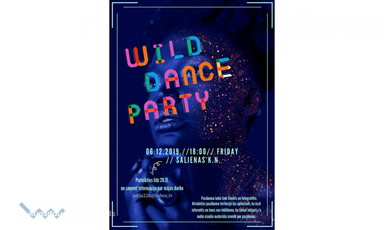 6.decembrī Salienas kultūras namā norisināsies novada jauniešu sadraudzības vakars “Wild dance”, kuru organizē Salienas pagasta jaunieši. Tiek aicinātas pagastu komandas līdz 15 cilvēku sastāvā. Katram pagastam ir jāsagatavo deja, kuru vērtēs “profesionālā” žūrija. Pasākuma sākums plkst.18.00.