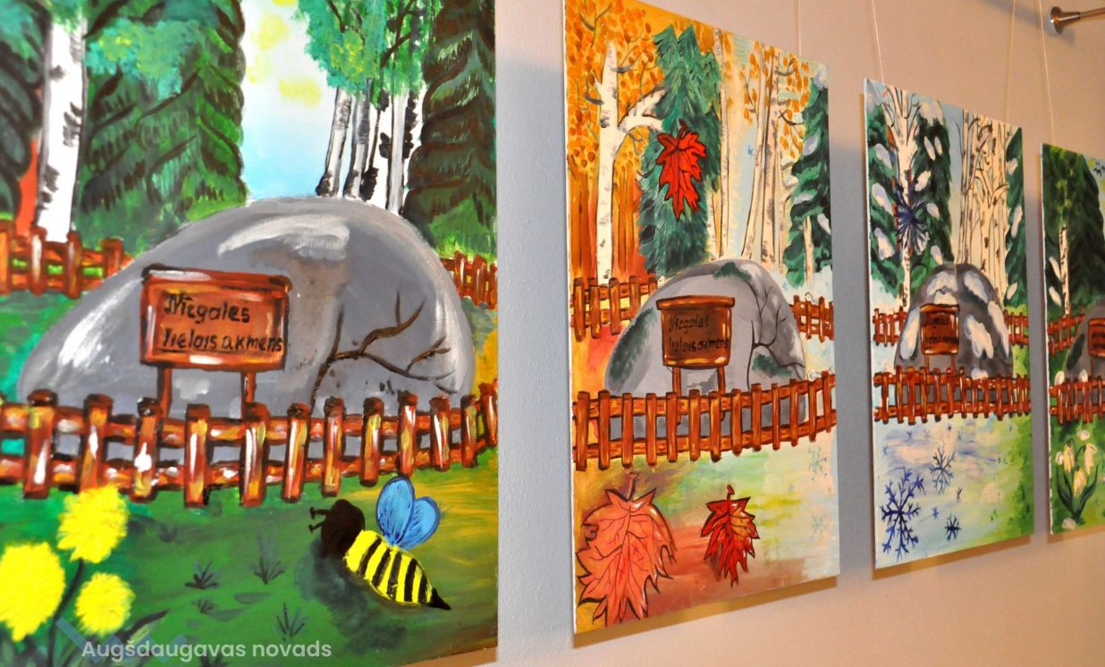 Izstāde “Četri skati” ir veltījums Latvijai simtgadē un tajā apkopoti piecu pagastu iesniegtie zīmējumi. Zīmējumos redzamos objektus katrs mākslinieks attēloja četros gadalaikos. Nīcgales lielo akmeni gleznoja Sigita Skutele, Biķernieku pagasta Varavīksni un mīlestības koku - Olga Pankova, Medumu pagasta ezeru - Valērija Kožemjakina un tiltu pār Poguļankas upīti – Salienas kultūras nama vadītāja un izstādes idejas iniciatore Jeļena Ondzule. Jeļena uzsvēra, ka katrs Latvijas stūrītis ir skaits ikvienā gadalaikā, tieši tāpēc mākslinieki tos parādīja visā krāšņumā.
