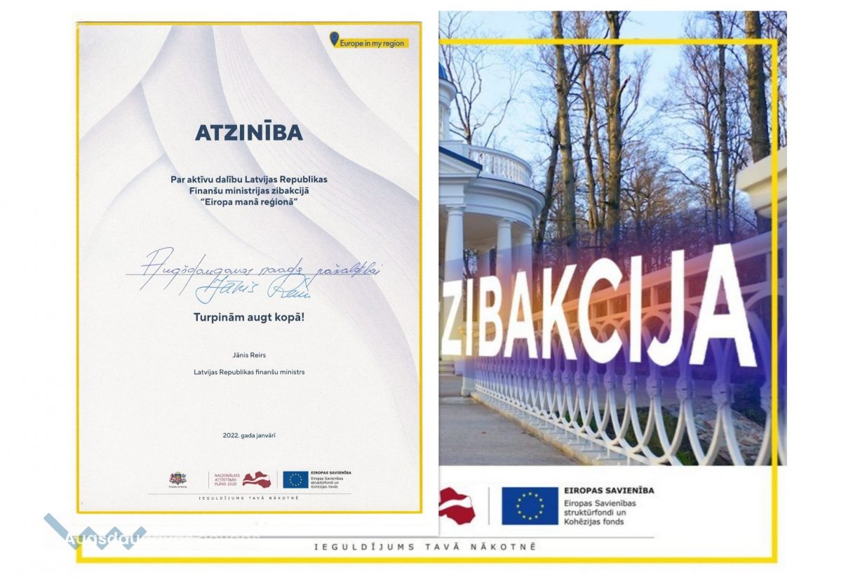 Augšdaugavas novada pašvaldība ir saņēmusi LR finanšu ministra Jāņa Reira Atzinību par aktīvu dalību Latvijas Republikas Finanšu ministrijas zibakcijā “Eiropa manā reģionā”.