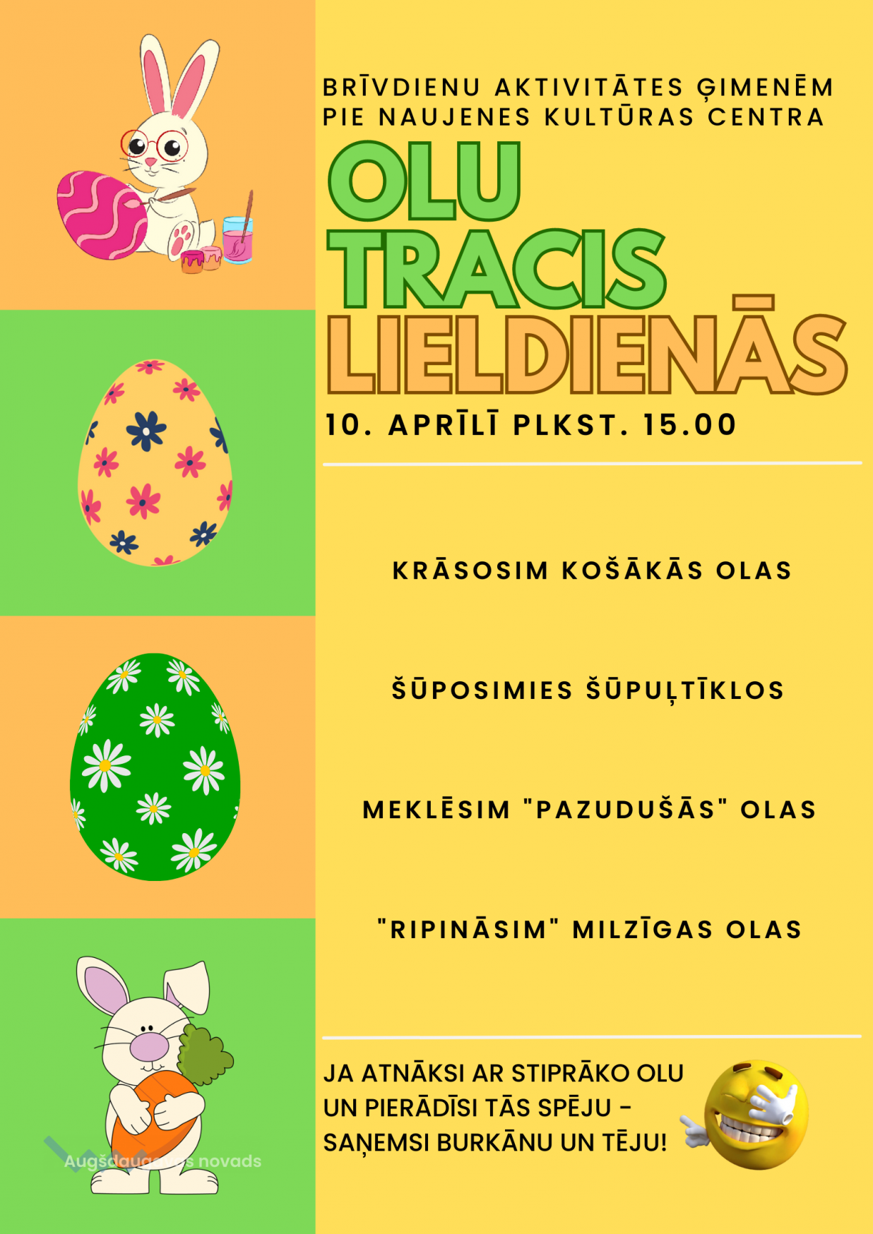 Aicinām Tevi un Tevi, un arī Tevi, un visu Tavu ģimeni otrajās Lieldienās ciemos! 10. aprīlī plkst. 15.00 gaidīsim gan mazus, gan lielus pie Naujenes kultūras centra (nelabvēlīgu laikapstākļu gadījumā Naujenes kultūras centrā) – svinēsim Lieldienas kopā!