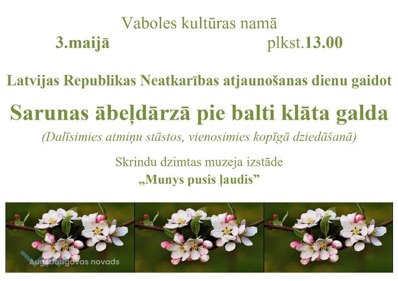 3. maijā plkst. 13.00 Vaboles pagasta kultūras namā - sarunas ābeļdārzā pie balti klāta galda.