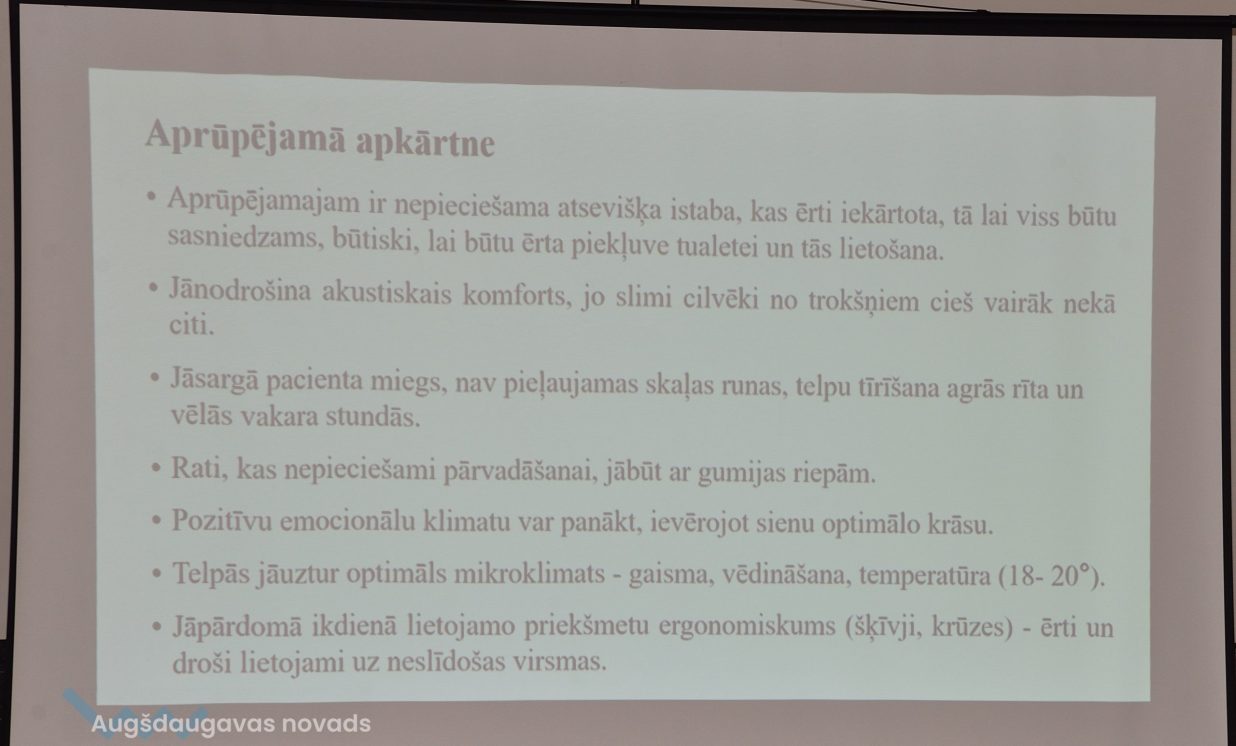 Augšdaugavas novada Sociālā dienesta vadītāja Anna Jegorova atzīst, ka šādi semināri ir ļoti svarīgi tiem iedzīvotājiem, kas mājas apstākļos veic sava tuvinieka, ģimenes locekļa vai kaimiņa aprūpi. Nereti esot situācijas, kad aprūpētājs īsti nezina, kā pareizi rīkoties dažādās situācijās, bet seminārā viņš var apvienot teoriju ar praksi, apgūt iemaņas un uzzināt dažādus knifus, kas ir svarīgi, aprūpējot gulošu pacientu. “Augšdaugavas novadā ir labi attīstīts mājas aprūpes pakalpojums, jo vecie cilvēki un tie, kas piedzīvojuši insultu, infarktu vai kādu traumu, lielākoties ir guloši, bet nevēlas atstāt mājas, lai dotos uz aprūpes iestādi. Bet mums ir iespēja nodrošināt aprūpētāju vai ģimenes locekli, kaimiņu vai brīvprātīgo, kas var viņam, palīdzēt mājās. Mums ir 16 aprūpētāji novadā, kam nav īpašas izglītības aprūpē, bet kas savas dzīves gaitā ir iemācījušies šīs iemaņas un aprūpē vairāk nekā 35 iedzīvotājus. Tas ir liels skaitlis, faktiski šāds klientu skaits nozīmē veselu aprūpes iestādi,” saka A. Jegorova. Viņa piebilst, ka aprūpes pakalpojums ir maksas, taču tuvinieki var aprūpēt savus ģimenes locekļus paši, bet tamdēļ nepieciešamas zināšanas, ko var iegūt šādos semināros.