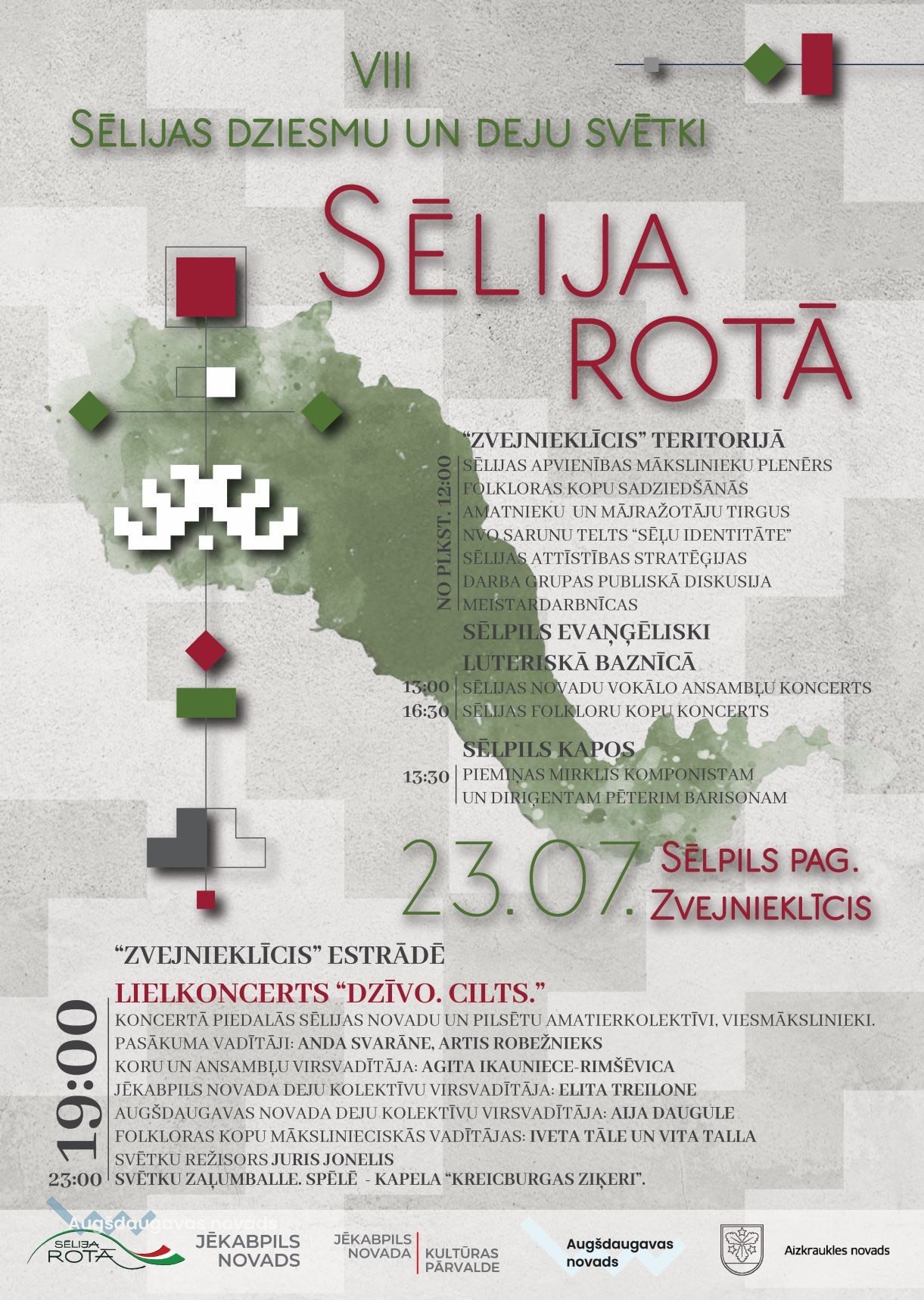 Svētki “Sēlija Rotā” norisināsies visas dienas garumā, uzsverot tautas mākslas nozīmi. No pulksten 12.00 brīvdabas atpūtas kompleksa “Zvejnieklīcis” teritorijā paredzēts Sēlijas apvienības mākslinieku plenērs un gleznu izstāde, amatnieku un mājražotāju tirgus, dažādas meistardarbnīcas, Sēlijas pūtēju orķestru un folkloras kopu radošās programmas, kā arī darbosies nevalstisko organizāciju sarunu telts “Sēļu identitāte”.
