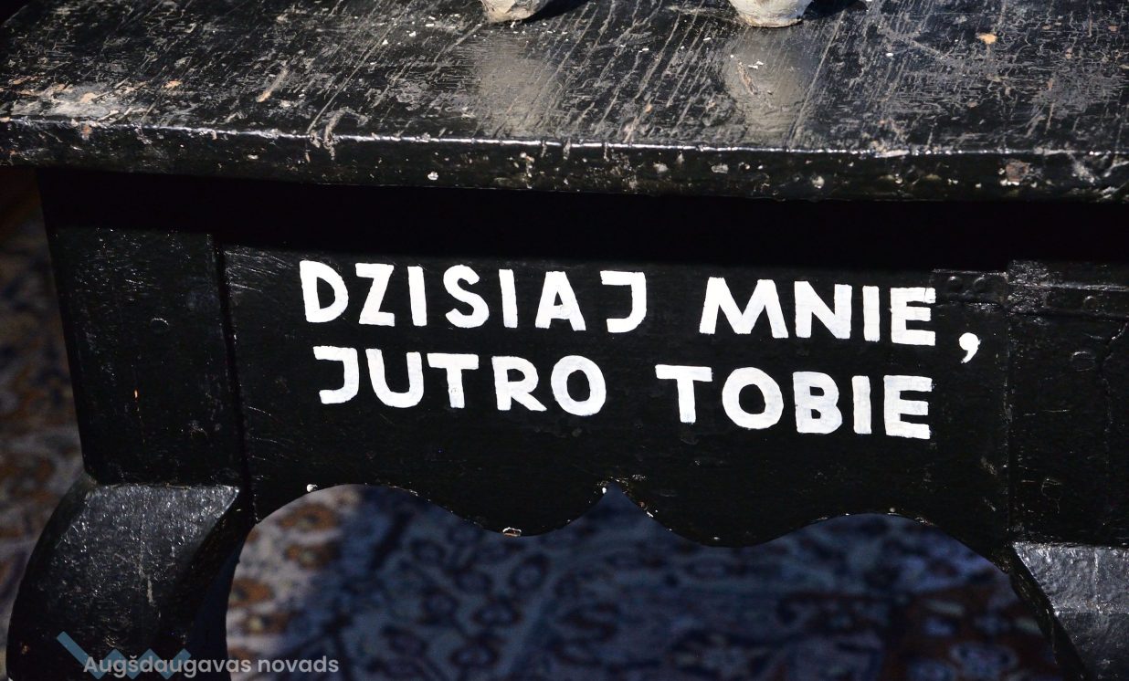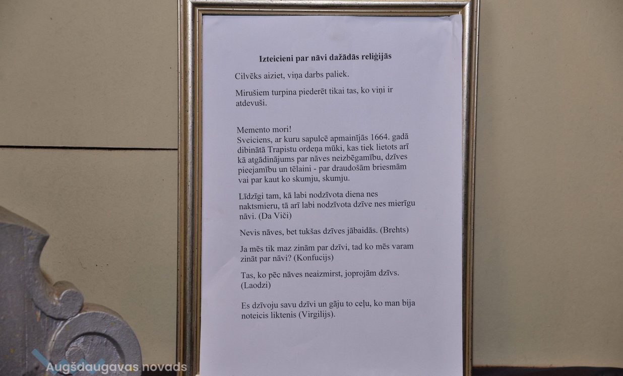 Šīs ieceres īstenošanai šogad saņemts atbalsts no novada pašvaldības 310 eiro apmērā. Telpā izvietoti 12 stendi ar informāciju par apbedīšanas tradīcijām, svečturi un citi kulta priekšmeti, kas senāk izmantoti bērēs. Viens no centrālajiem apskates objektiem ir instalācija, veltīta Visu svēto piemiņas dienai, kādu agrāk uzstādīja baznīcās, suminot visus aizgājējus. Katafalks ar zārka imitāciju šurp atvests no Grīvas Romas katoļu baznīcas, kas to saglabājusi, lai arī mūsdienās dievkalpojumos vairs neizmanto. Šo instalāciju rotā uzraksts poļu un latviešu valodā “Šodien man, rītu tev” kā atgādinājums, ka nekas nav mūžīgs.