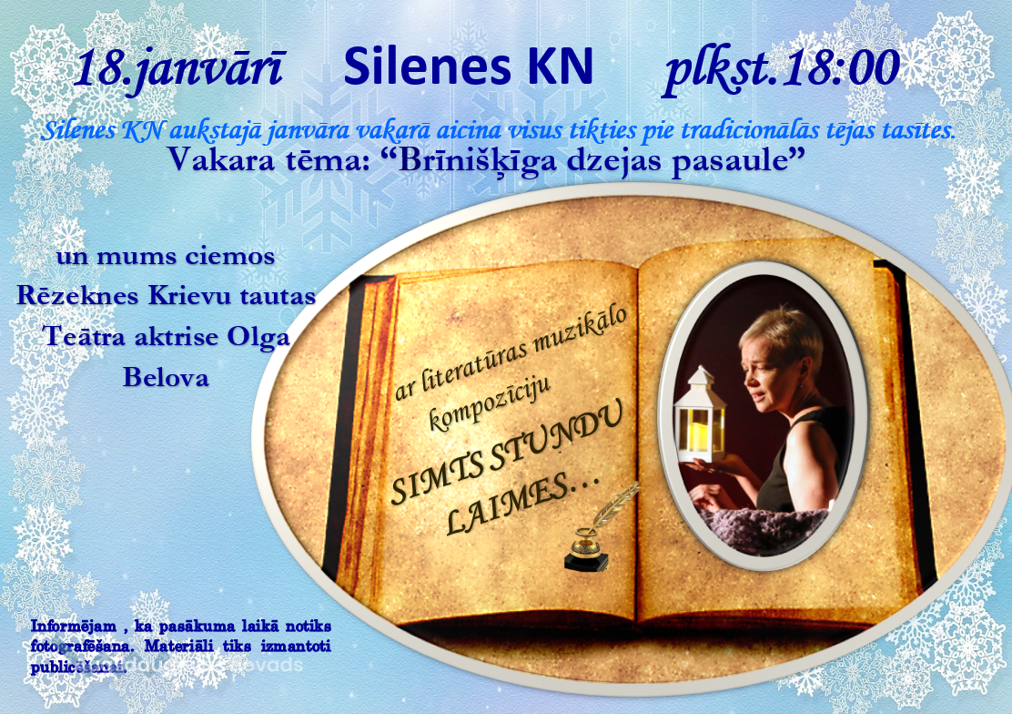 18. janvārī plkst. 18.00 Silenes kultūras namā viesosies Rēzeknes Krievu tautas teātra aktrise Olga Belova ar literatūras muzikālo kompozīciju "Simts stundu laimes".