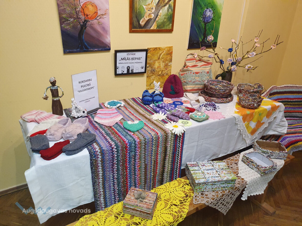 Foajē bija iespēja iepazīties ar rokdarbu pulciņa “Kaleidoskops” vietējo rokdarbnieču dažādu tehniku darbiem. Šeit bija gan adīti, gan austi darbi.