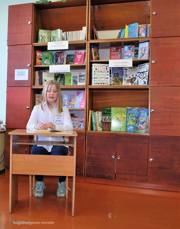Mūsu skolu konkursā Naujenes tautas bibliotēkā pārstāvēs Daniela Ērika LAPIŅA, kuras lasījumu žūrija un klausītāji novērtēja visaugstāk. Meitene lasīšanai bija izvēlējusies fragmentu no Ē. Kestnera grāmatas “Divas Lotiņas”. 2.vietu ieguva Jūlija Goluba, bet 3. vietu – Alise Kislaja.