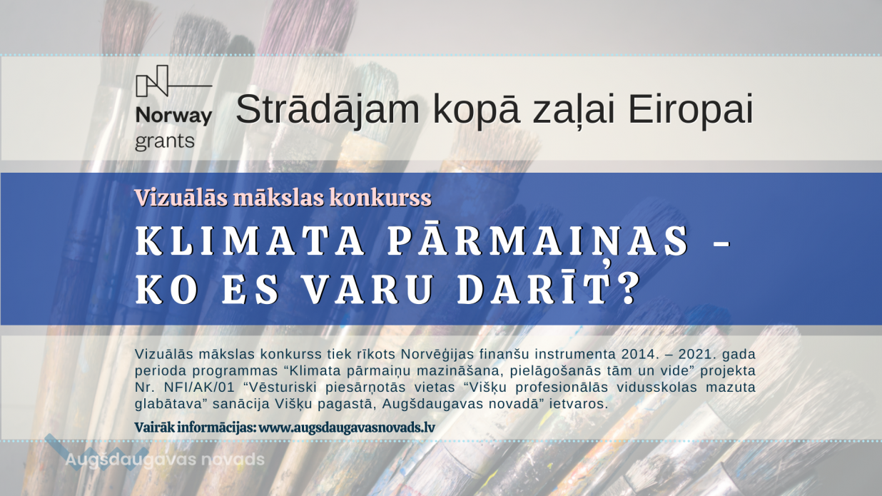 The visual art competition is organized within the framework of project No. NFI / AK / 01 “Rehabilitation of the Historically Polluted Site “Heavy fuel oil storage of Višķi Vocational Secondary School” in Višķi parish, Augšdaugava Municipality” within the Norwegian Financial Mechanism 2014-2021 programme "Climate Change Mitigation, Adaptation and Environment".